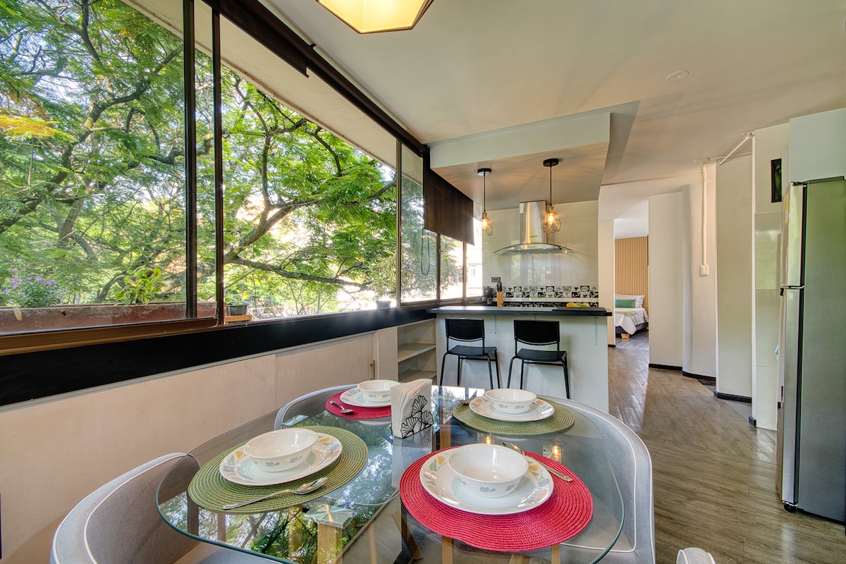 Modernaus dizaino pastatas, iš kurio atsiveria geriausi vaizdai į Kalį, yra strateginėje vietoje miesto šiaurėje - bus labai lengva suplanuoti apsilankymą! Netoli oro uosto, prekybos centrų ir gastronomijos zonos. Butas su dideliu privačiu balkonu su hamaku ir sofa, dvigule lova, rašomuoju stalu, pilnai įrengta virtuve, skalbimo mašina ir vonios kambariu. Terasa su 360 vaizdų į Kalio miestą leis mėgautis vėjeliu ir Caleños saulėlydžiais. Jame yra lauko dušas ir kepsninė.