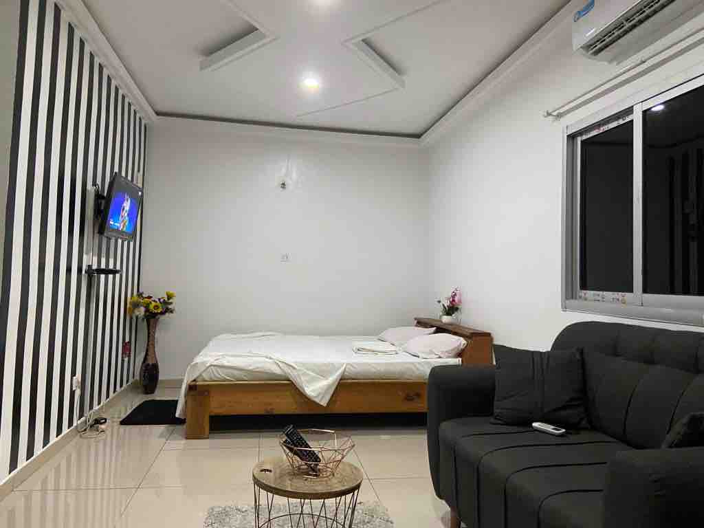 Une suite assez spacieuse pour rendre votre sejour assez inoubiable...Vous avez un petit coin sejour séparé de l espace chambre par une baie vitree...la cuisine equipee est assez grande pour votre repas. La douche est alimentee en eau chaude ..En outre la suite dispose de la fibre optique ( internet haut debit)e de chaines cablees et de l air conditionné ...
