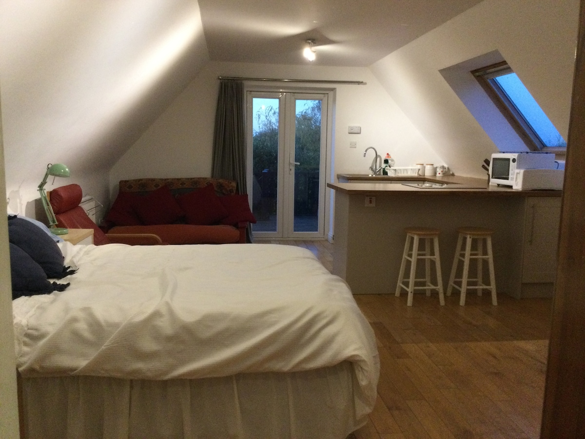 1 lovos studija virš garažo, į kurią patenkama 13 išorinių laiptų. Grindys, sodo baldai. Iš jo atsiveria vaizdas į apylinkes. Virtuvė, dušo kambarys, karališko dydžio lova, svetainės zona. Mikrobangų krosnelė, orkaitė, indukcinė viryklė, pusryčių baras. Daug lizdų. 2 USB prievadai. Televizija naudojant internetą ir programėles. Tik poroms / vienišiems. Internetas per 4G, esame kaime, gali dingti. Jokių kūdikių ar mažų vaikų. Puiki vieta Cotswolds/Swindon. Nemokama vieta pastatyti automobilį. Atvykimas 1500 Išvykimas 1100. Draudžiama atvykti su augintiniais. Draudžiama rūkyti.