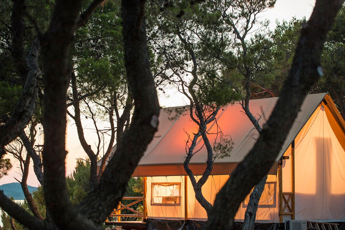 Glamping for 4 persons in our Golden Haven Resort on Murter, at the beach. Jei norite jaustis kaip kempingas, bet turi visą privataus buto komfortą, Glamping yra jūsų pasirinkimas. Mūsų Glamping palapinėje keturiems žmonėms yra privatus baseinas su vaizdu į jūrą. Mūsų glamūrinėje palapinėje yra vonios kambarys su dušu ir tualetu, taip pat virtuvėlė. Tai puikus variantas šeimoms, nedidelėms draugų grupėms ar poroms, norinčioms prabangiai praleisti laiką mūsų kurorte, tačiau vis tiek norinčioms pasijusti viena su gamta.