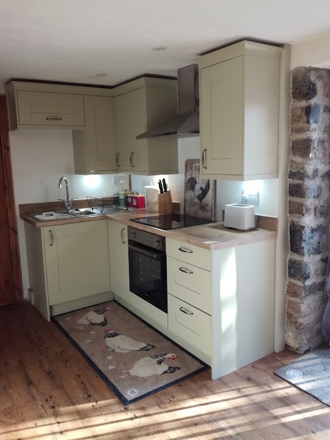 Savarankiškas garažo pertvarkymas, kurį sudaro: Miegamasis (dvigulė lova), vonios kambarys, jauki gyvenamoji erdvė su rąstų degikliu. Virtuvės zona su kaitlente (be ORKAITĖS), oro gruzdintuvu, šaldytuvu, virduliu ir mikrobangų krosnele. Pateikiama arbata/kava/pienas ir kai kurie pusryčiai (duona/grūdai). Kaip ir rankšluosčiai bei patalynė, tualetinio popieriaus ritinėlis ir rankų muilas. Lauko sėdimoji zona su vaizdai į kaimą. 5 minutės pėsčiomis iki pakrantės tako. Nuostabus kaimo baras su nuostabiu vaizdu į jūrą vos už kelių minučių kelio pėsčiomis. Deja, neleidžiame apsistoti su augintiniais.