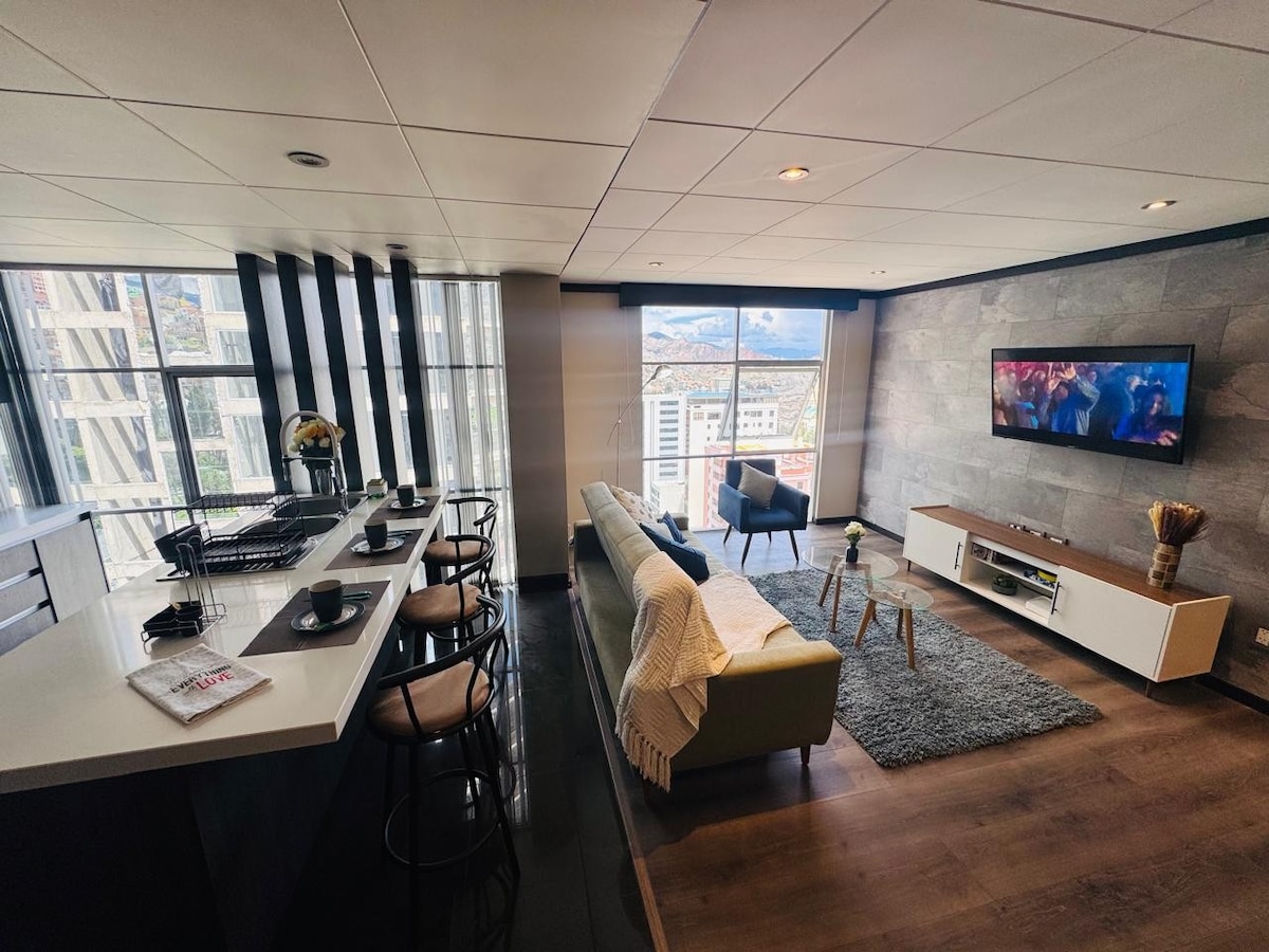 Penthause exclusivo con vista panorámica inigualable del "Illimani" y la ciudad. - Ubicado en el corazón de Sopocachi, cerca de supermercados, restaurantes y trasporte público. - Wifi 5G - Cocina independiente, Nexflix, lavadora y agua caliente. - Acceso seguro y privado con ascensores panorámicos y seguridad 24/7 1. Habitación principal cama QUEEN para 1 o 2 personas Dólares 38 (la segunda permanece cerrada) 2. Segunda habitación (opcional) cama doble disponible por 10 dólares por persona.
