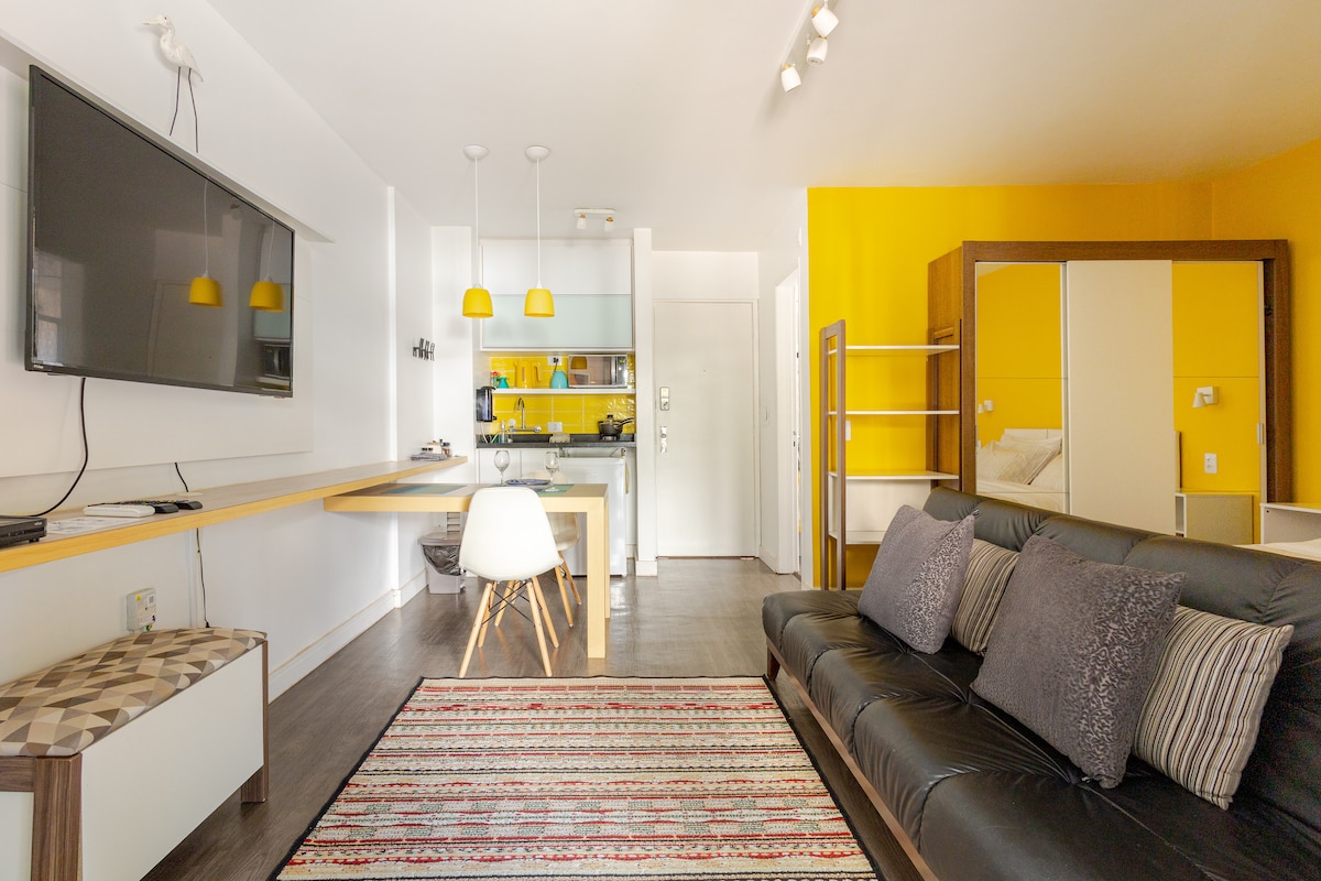 Sveiki atvykę į mūsų jaukią studiją Piliečių centre! Mėgaukitės patogia viešnage šioje integruotoje erdvėje su balkonu ir vaizdu į Popiežiaus mišką. Su modernia įranga, įskaitant išmanųjį televizorių 50col., dvigulę lovą ir patogią sofą-lovą iki dviejų vaikų, taip pat aukštos kokybės lovų ir vonios patalynę. Mėgaukitės netoliese esančiais restoranais, lankytinomis vietomis ir ramia šios gatvės atmosfera. Užsisakykite dabar ir sužinokite, ką Curitiba gali pasiūlyti!
