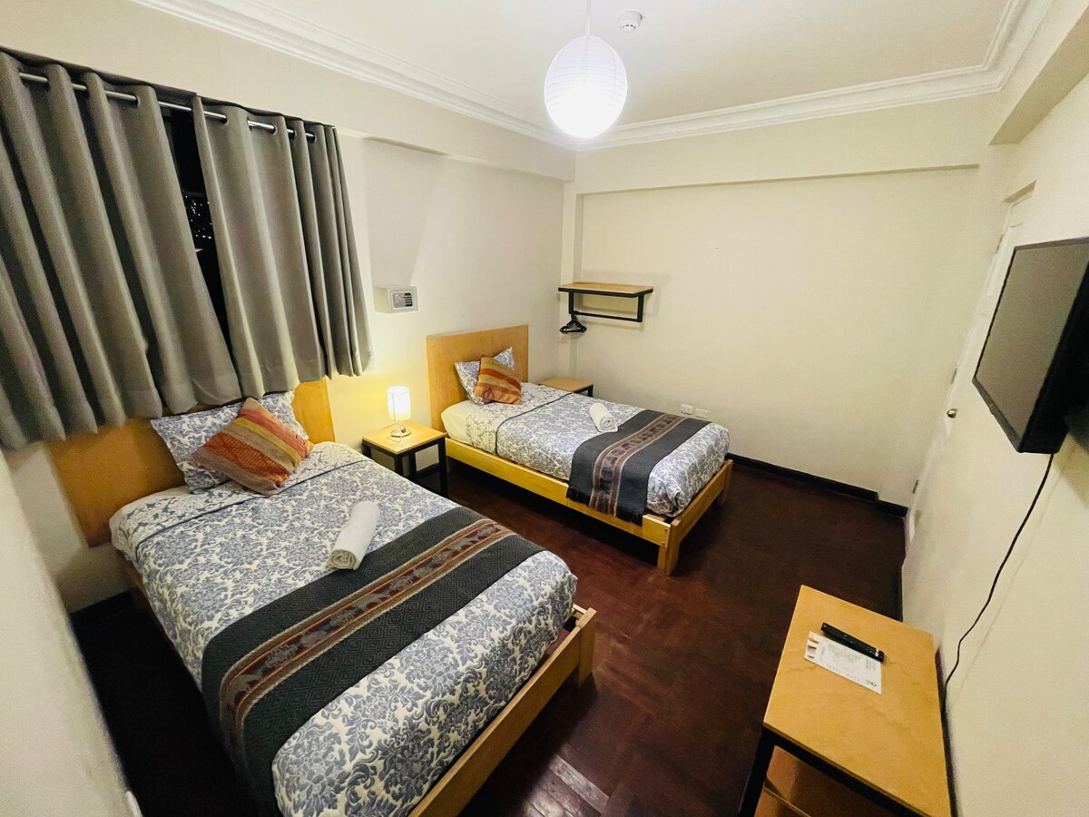 Disfruta de una estadia agradable en un lugar con muy buen ambiente y sobre todo seguro . Ubicado en el corazon del Centro de Cusco a menos de media cuadra del Mercado de San Pedro y de la estacion de tren de San Pedro, fácil acceso a tiendas atractivos turisticos y de la Plaza de Armas. Habitacion con Smart Tv, Internet de alta velocidad, Baño privado con agua Caliente garantizada las 24 horas del dia.