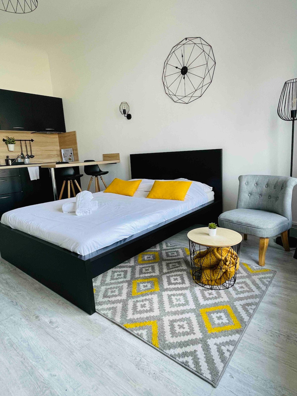 Trečiame saugios gyvenamosios vietos aukšte su liftu ši 14 m2 studija, kurią visiškai renovavo interjero dizaineris, buvo suprojektuota taip, kad ji būtų funkcionali ir patogi. Netrukdomas vaizdas, nepamirštamas vaizdas, siūlo daug šviesos. Jo orientacija kiemo pusėje suteikia garantuotą ramybę. Šis butas yra pačioje miesto širdyje, todėl galite viską nuveikti pėsčiomis (apsipirkimą, kiną, termines vonias, barus, restoranus, parkus, operą, traukinių stotį) Automobilių stovėjimas gatvėje yra nemokamas.