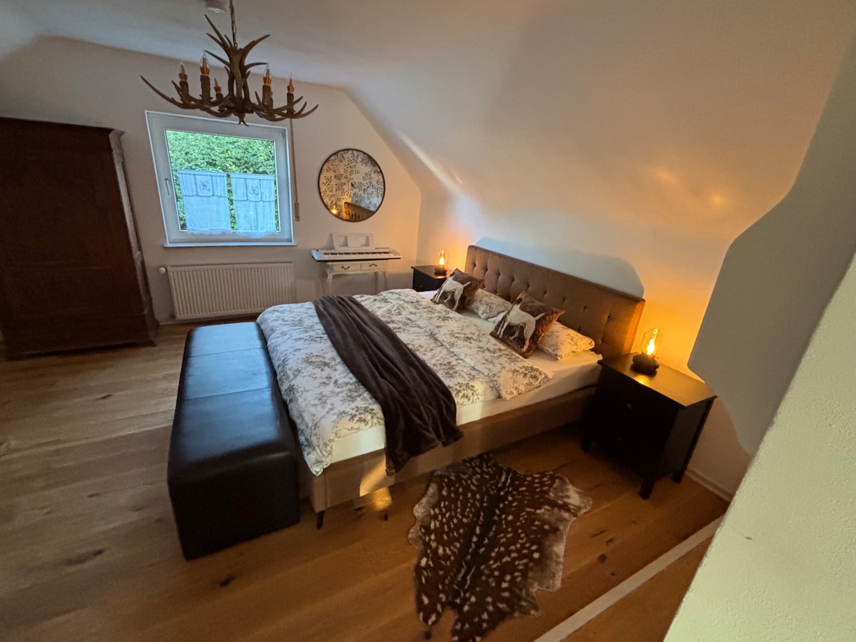 Entspannt euch in unserer besonderen und ruhigen Unterkunft! Das neu eingerichtete Apartment für bis zu 4 Personen mit ca. 60 qm verteilt sich auf zwei Etagen. Hervorzuheben sind eine vollausgestattete Küche, TV, Schlafcouch, große Panoramafenster, ein gemütliches Boxspring-Bett, die eigene Terrasse mit Außenbestuhlung sowie ausreichend Kundenparkplätze. Das Panoramafenster der Ferienunterkunft ist Richtung Sonnenaufgang und Wald ausgerichtet. Wir freuen uns auf euren Besuch!