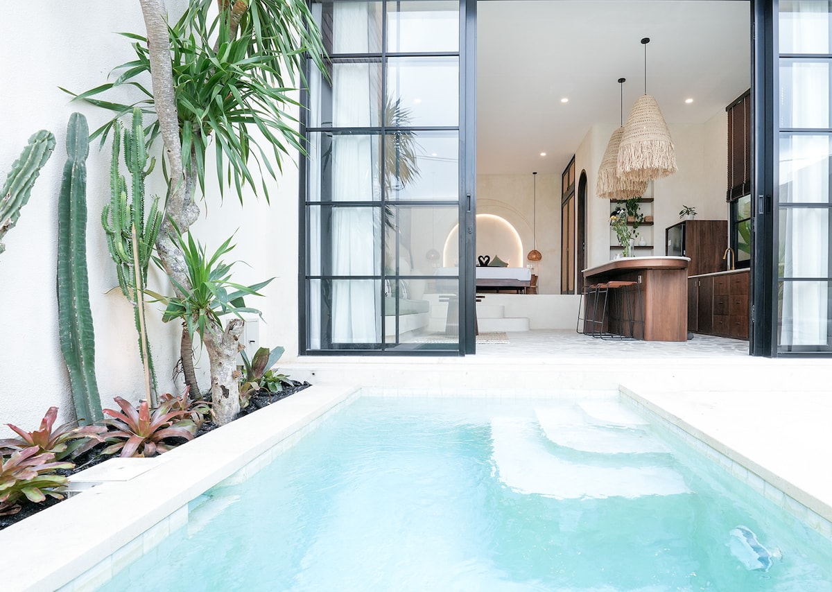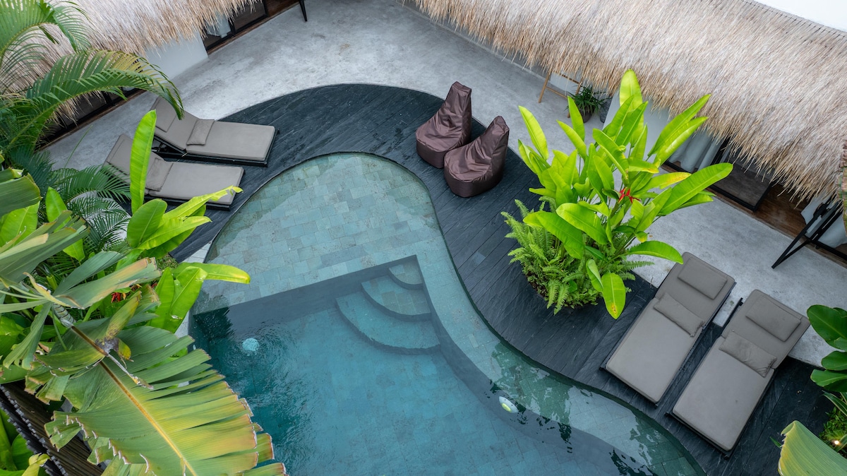 Pabėkite į mūsų visiškai naują 1 BR vilą su privačiu baseinu puikioje vietoje pačioje Kanggu širdyje. Tai puiki vila poroms ar pavieniams keliautojams, kurie mėgsta tyrinėti garsią vietą Kanggu. Vos 3-5 pėsčiomis iki puikaus restorano, parduotuvės, sporto salės, bendradarbiavimo, pilateso, kavinių ir barų. Vos už kelių minučių kelio nuo garsių paplūdimių, tokių kaip Nelayan, Batu Bolong, Canggu paplūdimys. Šioje viloje yra prabangi karališko dydžio lova, vonios kambarys su vonios kambariu, virtuvė, baseinas, svetainė ir atviros gyvenamosios erdvės atsipalaiduoti prie privataus baseino