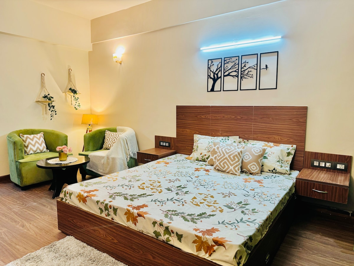 A cozy 2BHK home with a view straight out of a movie—watch sunsets, rainbows, and the Himalayas from your balcony overlooking a 9-hole golf course. Perfect for couples and families, it features a designated workspace with ergonomic chairs, handpicked furniture, and art. The living room is made for Netflix nights with a sound system, high-speed WiFi, and a fully equipped kitchen for home-style comfort. 15 mins to Rajpur road.