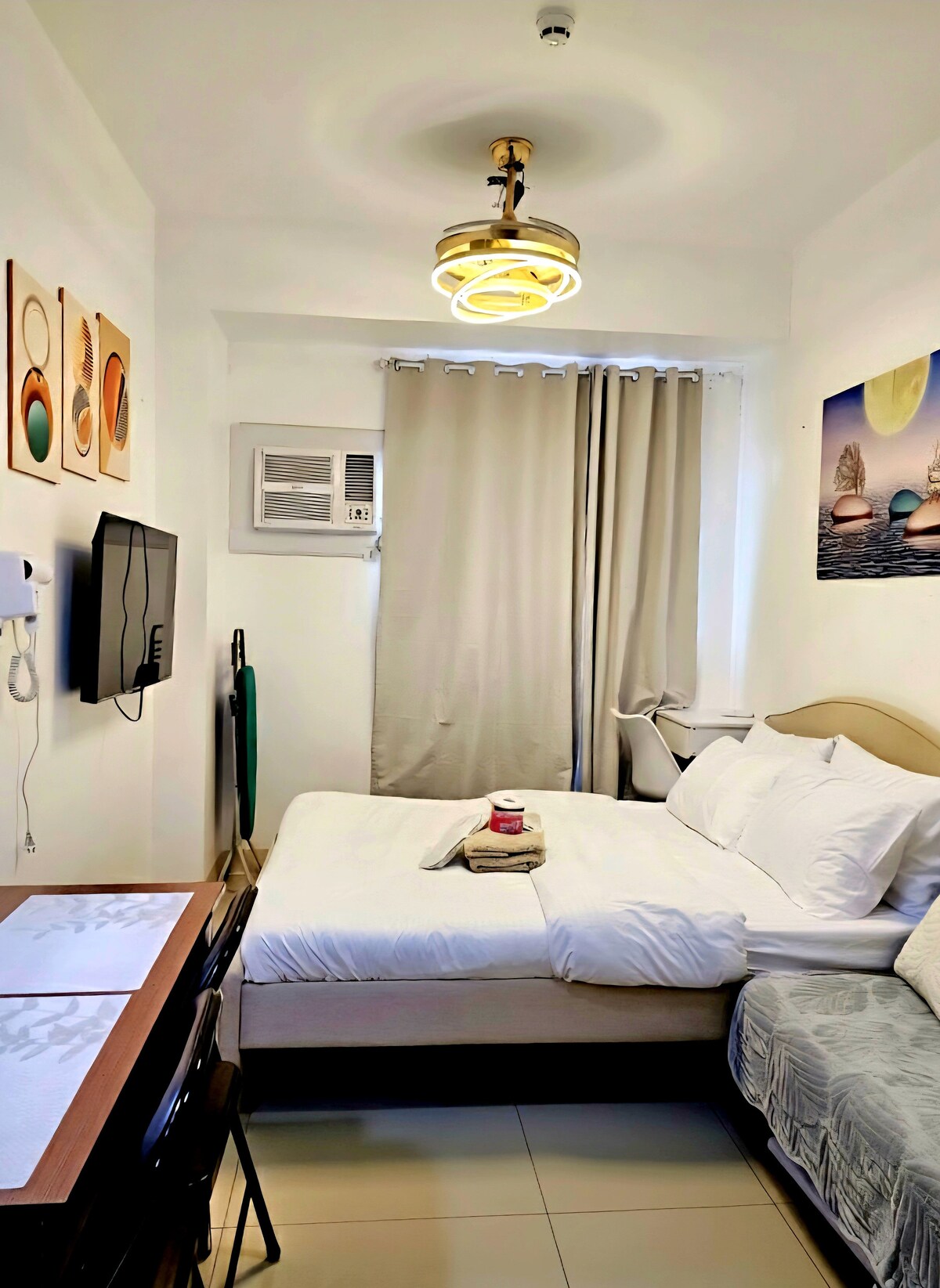 Take a break from the city—right within the city—on a budget. If you’re looking for a cozy place to spend quality time with your loved ones without leaving Metro Manila, this is the perfect staycation spot. Feel the cool breeze as you enter the gate, welcomed by pine trees that bring relaxing Tagaytay and Baguio vibes. The unit features a balcony, laundry area, kitchenware, a 50” Smart TV, a king-size bed, and all the amenities you need for a complete and comfortable staycation experience.