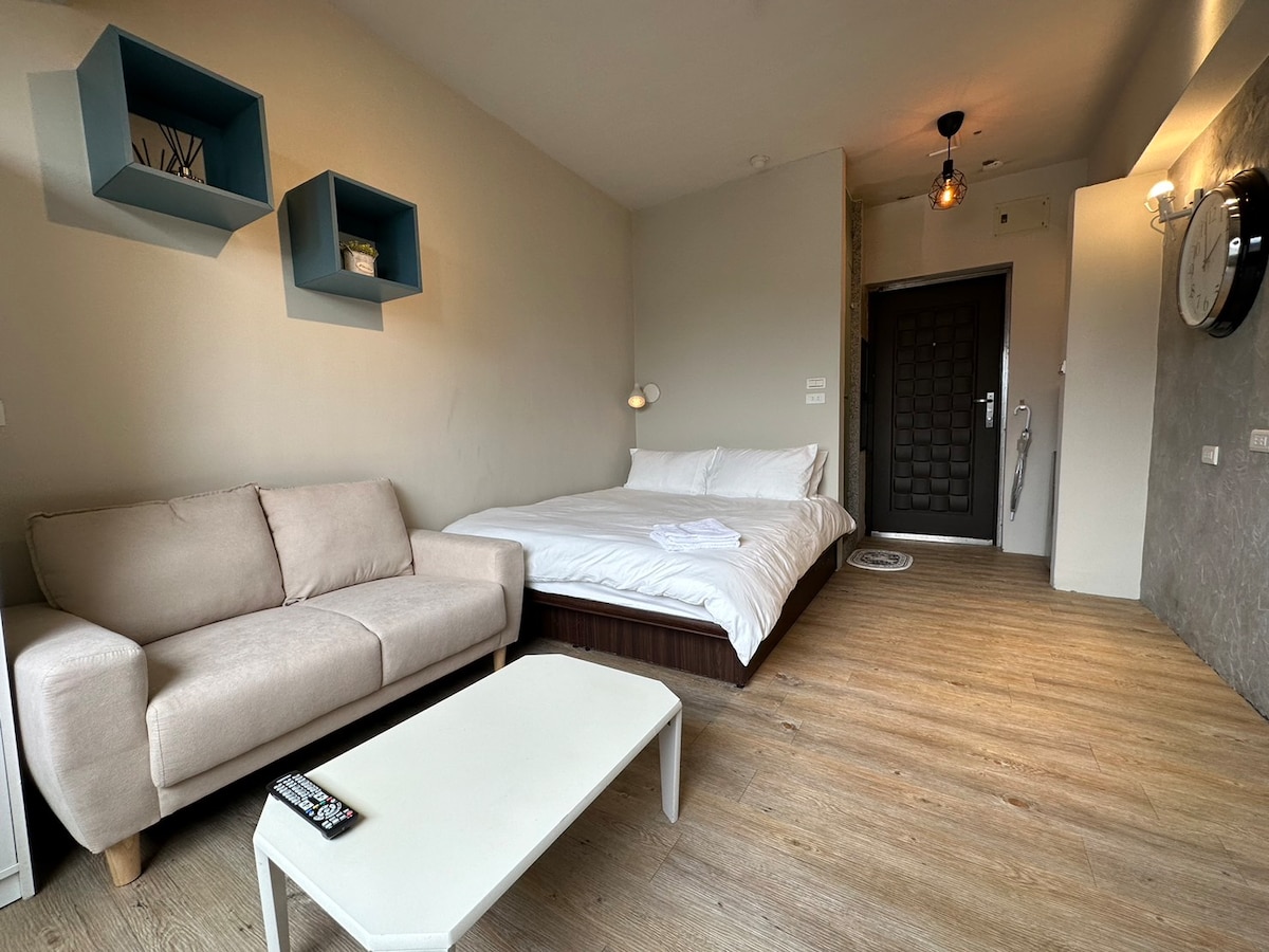 Mėgaukitės stilingu šio centre esančio būsto skoniu.Šis namas yra Nanxi Zhongshan prekybos rajone, Nanjing West Road, Taipėjaus mieste. Čia yra įvairių kūrybingų asmenybių parduotuvių. 3 min. iki MRT Zhongshan stoties, 10 minučių pėsčiomis nuo Taipėjaus geležinkelio stoties, 8 min. pėsčiomis nuo gyvybingo Ningxia naktinio turgaus , 5 min. kelio MRT iki triukšmingo Ximending miesto, Tiesioginis MRT Taipėjus 101, Vieta yra labai patogi. Stilinga ir minimalistinė dekoracija, Namas yra prie kelio, nes jis yra kelyje. Taigi, bus keletas automobilių. Jei esate jautrūs garsui, Rekomenduojama pasirinkti kitą mano kambario tipą. 201 kambaryje yra miegamasis, svetainė, privatus vonios kambarys, kuris yra atskira erdvė ir kurio nereikia dalytis su kitais.Kambaryje yra viengulė sofa-lova, o miegamajame yra standartinė dvigulė lova, kurioje gali apsistoti iki 3 žmonių. Šalia namo yra skalbimo mašinos, džiovyklės ir bagažo spintelės, kuriomis galima naudotis nemokamai. Yra vonios rankšluosčiai, šampūnas, kūno prausiklis, plaukų džiovintuvas ir nemokamas Wi-Fi. Turite atsinešti savo dantų pastą, dantų šepetėlį ir veido losjoną. Šiame kambaryje gali miegoti iki 4 asmenų. Vartojimas, Prabangus malonumas, Sveiki atvykę ^ ^