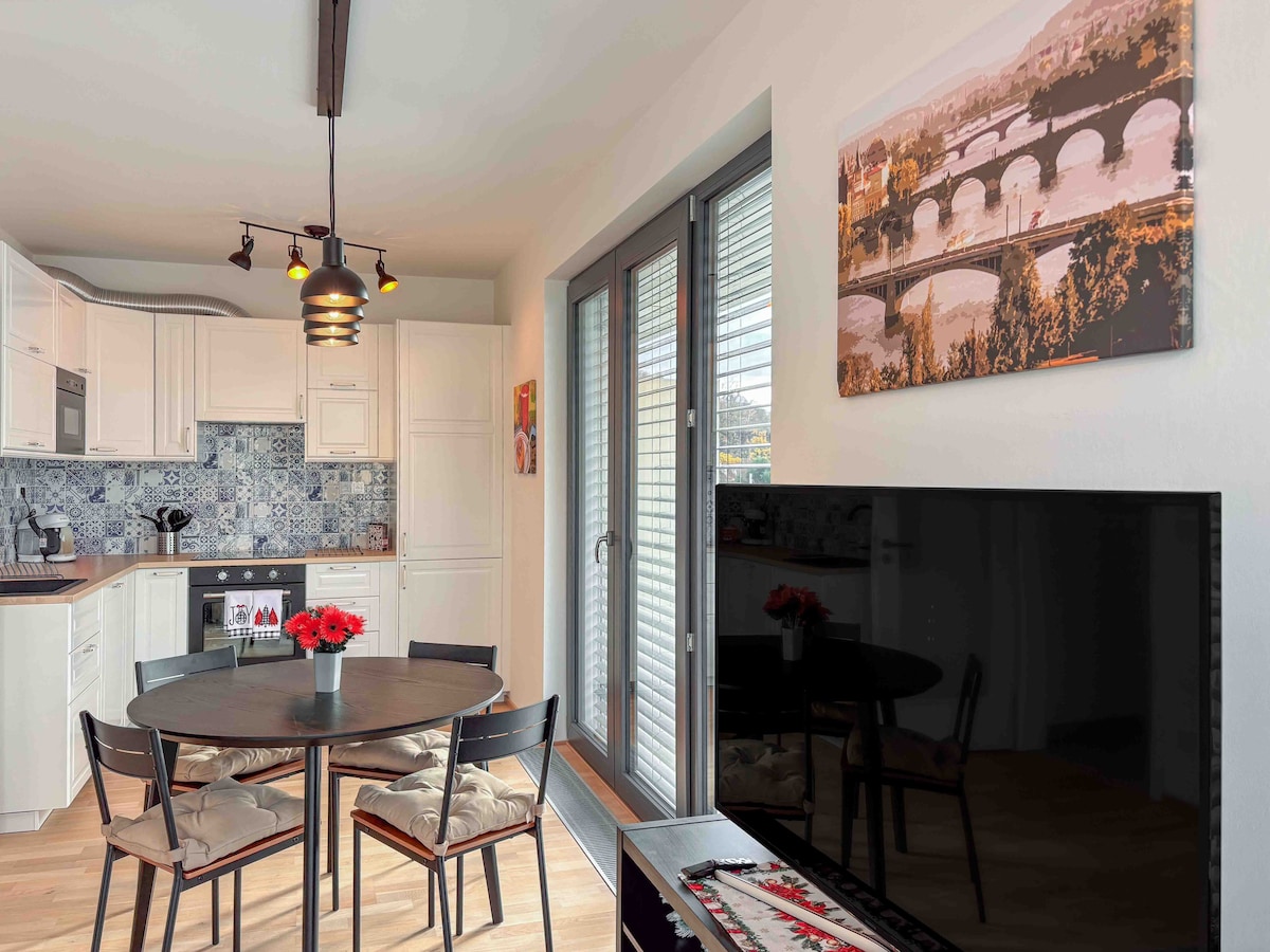 Erdvi ir šviesi vieta su išskirtiniais vaizdais sename gyvenamajame rajone. Prabangiai įrengtas butas suteikia komfortą bet kuriuo viešnagės metu. Pilnai įrengta virtuvė, vonios kambarys su dušu ir vonia su kvapą gniaužiančiu vaizdu, televizorius su „Netflix“, ramus miegamasis su patogia lova. Kavinės, kepyklos ir bistro, barai su geriausiu čekišku alumi ir virtuve, netoliese yra vietinis turgus. Tiesioginis viešasis transportas į oro uostą, traukinių stotį, Prahos pilį, senamiesčio astronominį laikrodį.