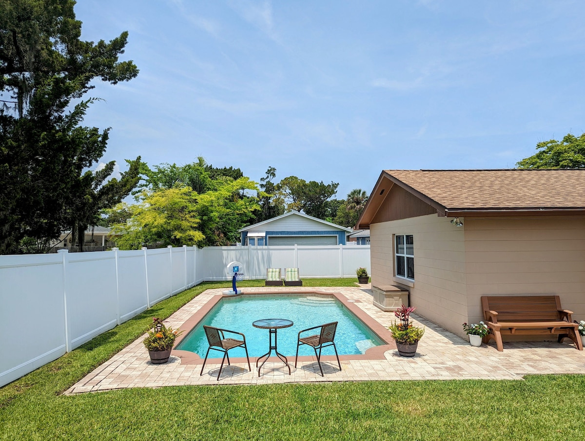 Vandenyje yra kažkas romantiško ir ramaus! „Daytona Delight“ yra daug! Esate už 6 minučių kelio nuo paplūdimio ir už kelių žingsnių nuo savo asmeninio baseino! Sukūrėme gražų ir erdvų butą/apartamentus su privačiu įėjimu, jūsų privačiu baseinu ir baseino terasa! Asmeninis vonios kambarys, kavos zona su Keurig, šaldytuvu, skrudintuvu ir mikrobangų krosnele. Puikiai švaru! Nėra bendros erdvės ir yra saugiame, ramiame rajone. Tai tobula, romantiška atogrąžų oazė!