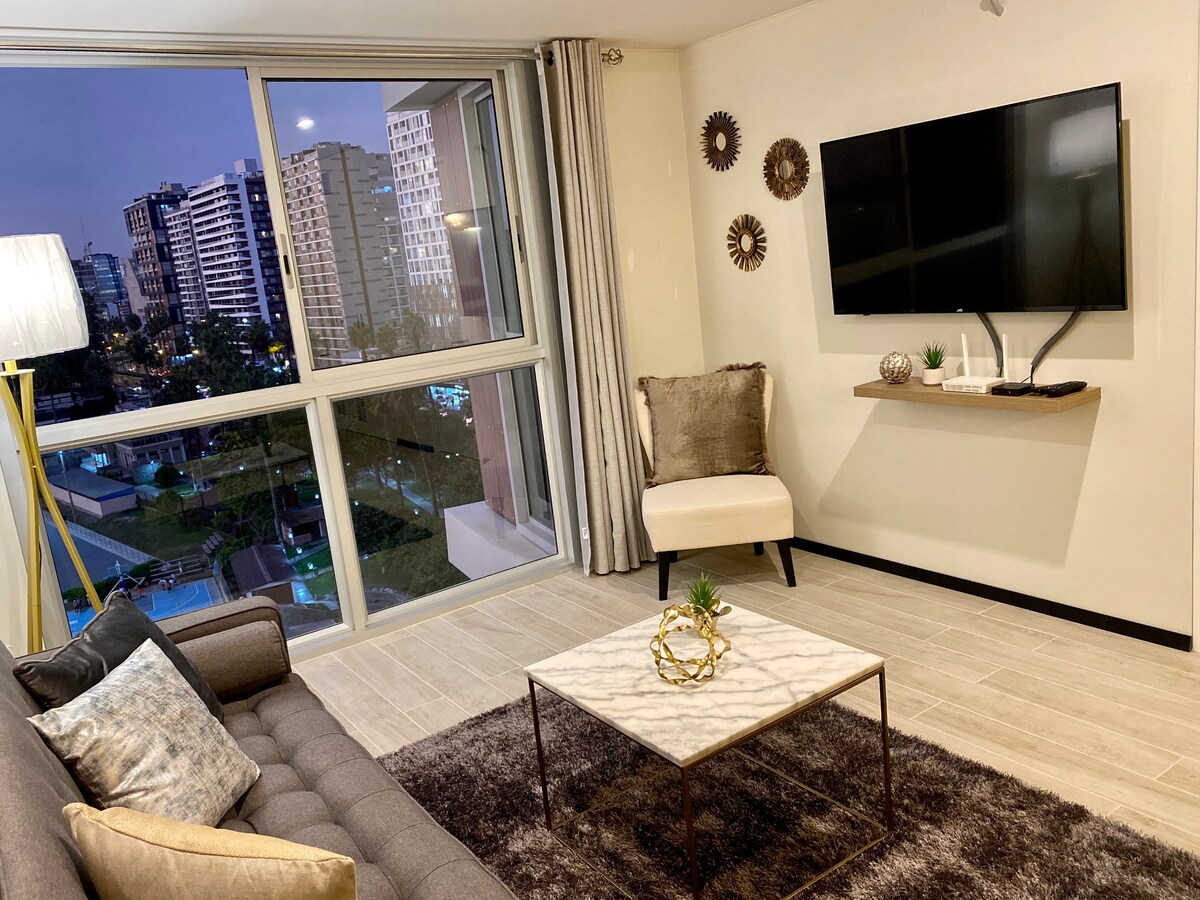 Šis stilingas loftas buvo sukurtas kiekviena paskutinė detalė. Įsikūręs Barranco, su Miraflores ir keliomis minutėmis nuo jūros, jis yra pastate su viskuo, ko jums reikia, baseinas 24-ame aukšte su panoraminiu vaizdu į miestą, bendradarbystės zoną ir biliardą (reikia ankstyvo užsakymo). NEMOKAMAI siūlome: •kavą ir kavą; • Didelės spartos Wi-Fi •baseinas (minus pirmadienį) •sporto salė • visa virtuvė •savarankiškas atvykimas •Labai patogi lova ir pagalvės. • 55 SmartTv: Prime video