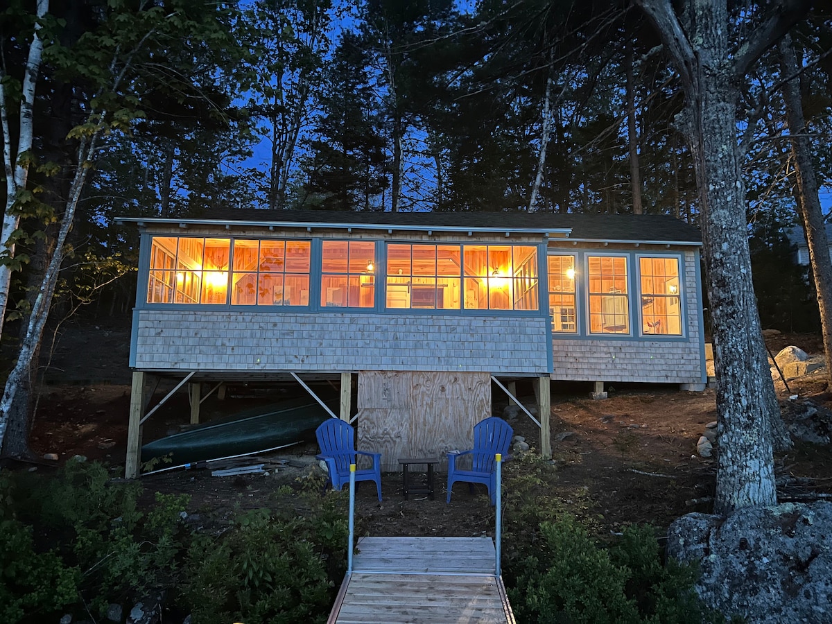 Private pet-friendly Maine cabin on 12 wooded acres and blueberry fields an hour from Acadia National Park. A favorite of couples visiting Maine for the first time. • 15 minutes to shopping, hiking, swimming • Fully equipped open kitchen/sitting room with gas fireplace • Screened porch with rocking chairs and chaise • Loft bedroom with full bed and new linens • WiFi, Roku TV, gas grill, stocked bar • EV charger • Seasonal wild blueberries • Dark skies, slow mornings, quiet nights