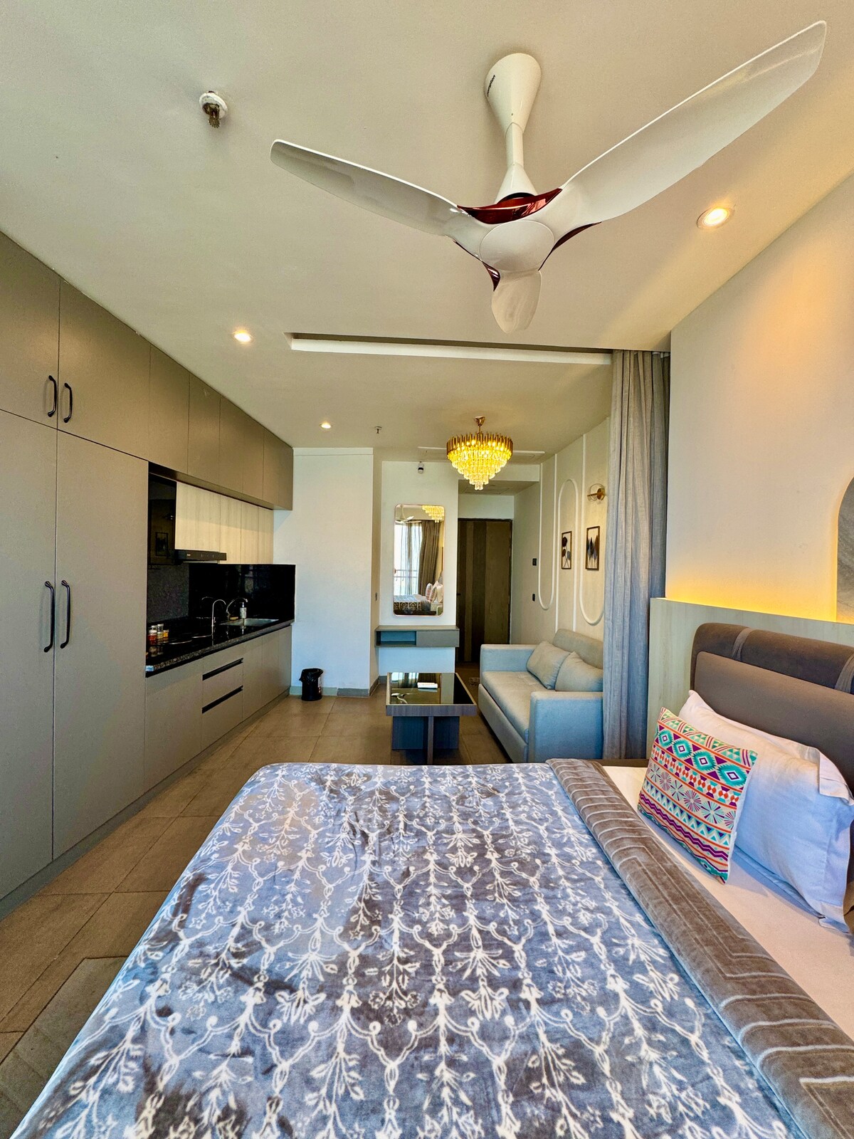 Sveiki atvykę į mūsų nuostabius apartamentus, esančius 15-ame aukštybinio pastato aukšte. Šis 2bhk yra visiškai naujas butas. Dėl plačios privačios terasos su vaizdu į miesto panoramą ji yra unikali klasėje. Ši vieta puikiai tinka atsipalaiduoti ir mėgautis vaizdingu šiuolaikinės architektūros vaizdu. Bute yra 3 išmanieji televizoriai (visos programos veikia), 2 jauki dvigulė lova, 2 didelė spinta su spintele, 6 vietų sofa, stilingas kavos staliukas,lyginimo lenta, šaldytuvas,mikrobangų krosnelė,indukcija,elektrinis virdulys, skrudintuvas ir dar daugiau