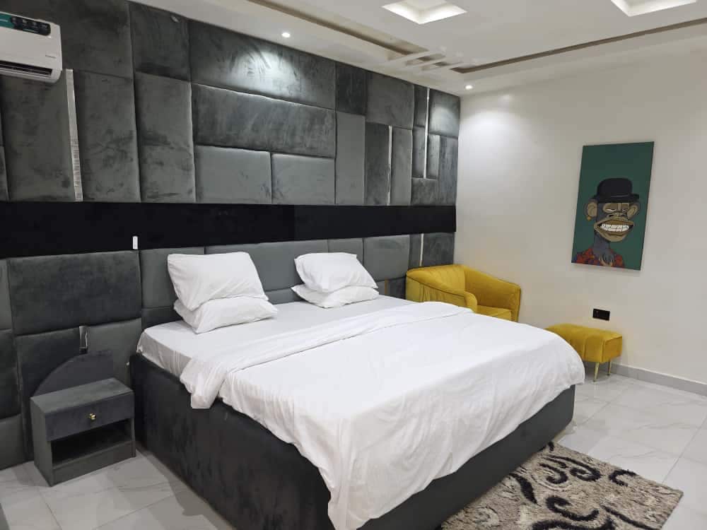 All Day uninterrupted power supply fully serviced round the clock house keeping fitted and functional kitchen smart tv free WiFi free and secure parking armed security guard government reserved area only 2 mins from all amenities including shopping cinema bar and lounges.