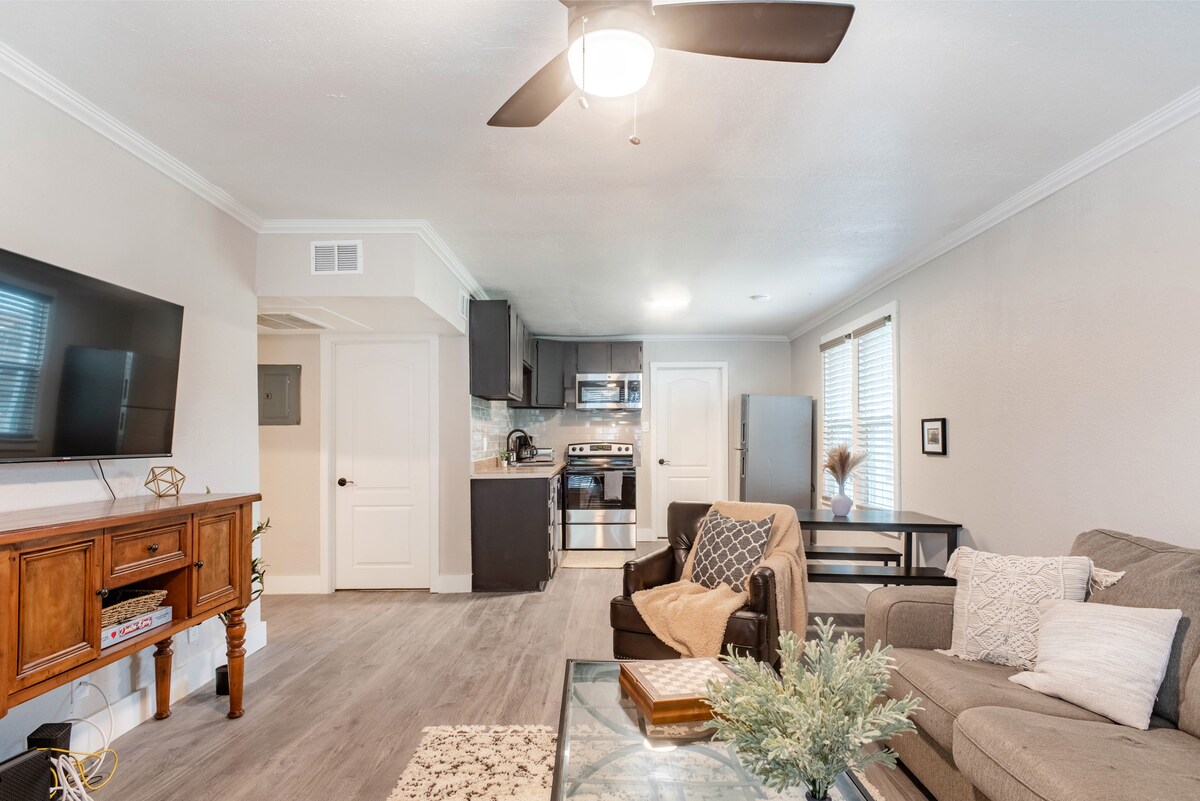 Atsipalaiduokite ir atsipalaiduokite šioje visiškai naujoje, ramioje, stilingoje studijoje. Įsikūręs netoli Interstate 35, tai puiki vieta greitai nuvykti į Dalasą arba į UNT koledžo miestelį. Mūsų svečiai mėgausis privačiu butu su pasivaikščiojimu duše, pilno dydžio prietaisais, skalbykle ir džiovykle bei visiškai užtemdančiais atspalviais tiems, kurie dirba naktimis arba mėgsta miegoti dienos metu. Ši erdvė puikiai tiktų tėvams, besilankantiems savo vaikams UNT arba keliaujantiems sveikatos priežiūros specialistams.