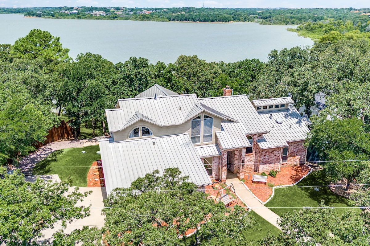 Top 5-rated home on Lake Lewisville! This 3BR/2BA modern farmhouse offers stunning lake views, two porches, completely remodeled, spa-like bathrooms—refinished hardwoods, a gourmet kitchen, stainless appliances, cozy furnishings, and dreamy beds. Set on over 1 gated acre, enjoy a private security gate, 5 STAR shared amenities: fishing, 8 person HOT TUB, kayaks, paddleboards, lake toys and BBQ Grill Stocked like a hotel but feels like home—perfect for relaxing or playing on the lake all day.