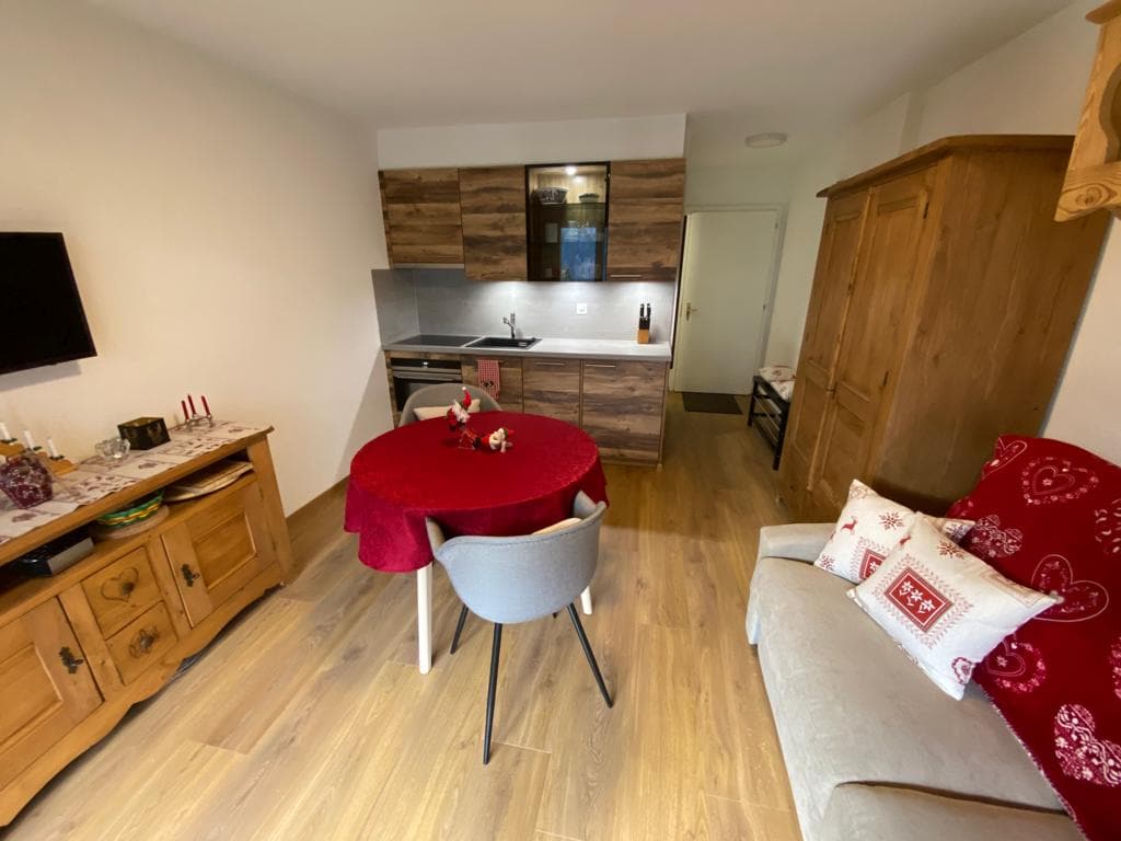 Cet appartement se compose de la façon suivante : - Un bel espace à vivre mansardé (chambre/séjour) avec coin salon de 2 fauteuils - Une cuisine équipée :2 plaques de cuisson,ustensiles de cuisine,micro-onde grille,bouilloire,cafetière,mini frigo avec emplacement congélateur,vaisselles et couverts,appareil à raclette 2 personnes - Une salle de douche+wc - Un accès indépendant - 1 place de parc Mise à disposition du garage/chaufferie pour stocker skis, chaussures, vélos, vêtements de ski, ..