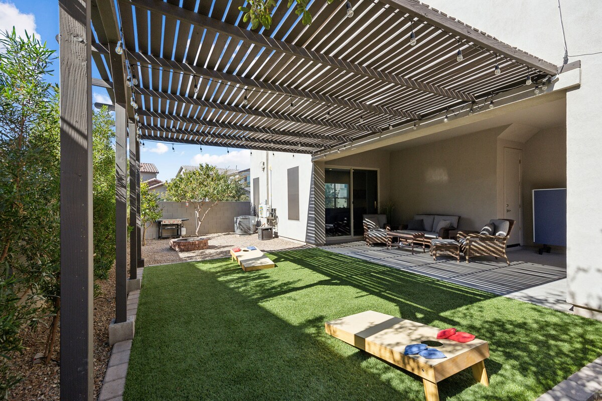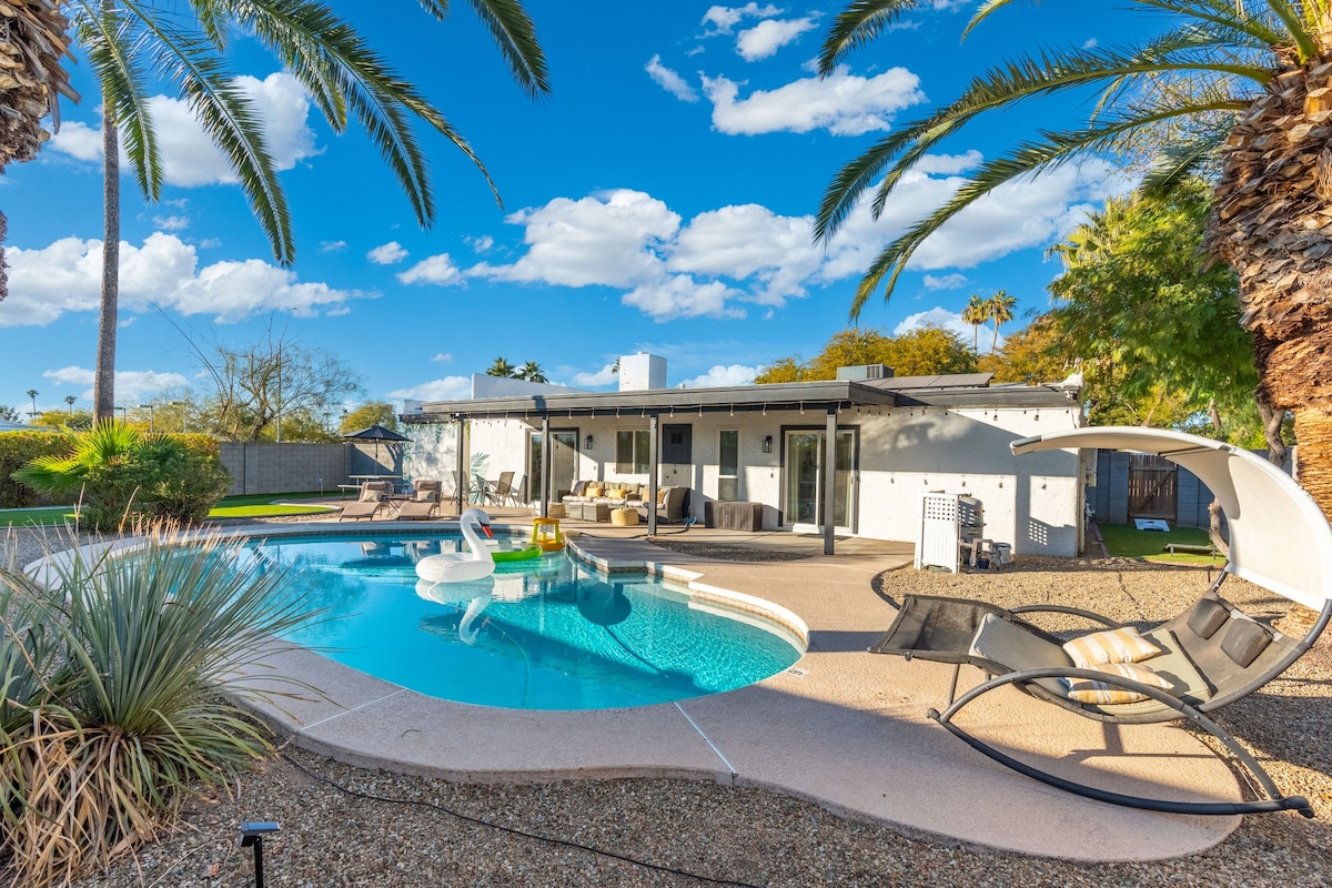 Revolution Retreat features a brand-new heated pool with travertine tile and turf backyard. The home was designed with an open floor plan and a unique style creating the perfect space for your vacation. It is located 3 miles from Old Town Scottsdale and 15 minutes from the airport, so you’re right in the middle of all of the valleys main attractions. The home sleeps up to 10 guests comfortably. (Please note that the pool can be heated for a fee, details below)