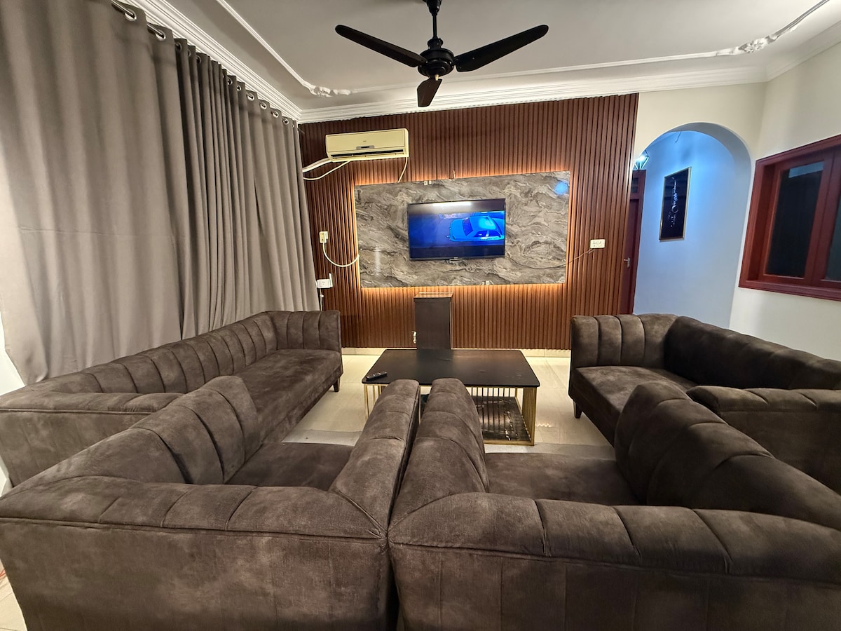 🛏️ Miegamieji: 5 erdvūs, pilnai įrengti kambariai su medinėmis grindimis, patogiomis lovomis ir spintomis, mini šaldytuvu, grįžtamuoju kintamosios srovės ir LED televizoriumi 🛋️ Svetainė ir valgomasis: 2 Elegantiški poilsio kambariai su jaukiomis sofomis ir išmaniuoju LED televizoriumi su NETFLIX ir valgomojo stalais. 🍽️ Virtuvė Pilnai įrengta virtuvė su virykle, mikrobangų krosnele, įrankiais. 🛁 Vonios kambariai: Išvalykite vonios kambarius karštu vandeniu ir švariais rankšluosčiais 📍 Vieta: netoli F-11 Markaz,mečetė, parkas 📶 Wi-Fi ir būtiniausi patogumai: Didelės spartos Wi-Fi, oro kondicionierius, šildymas.
