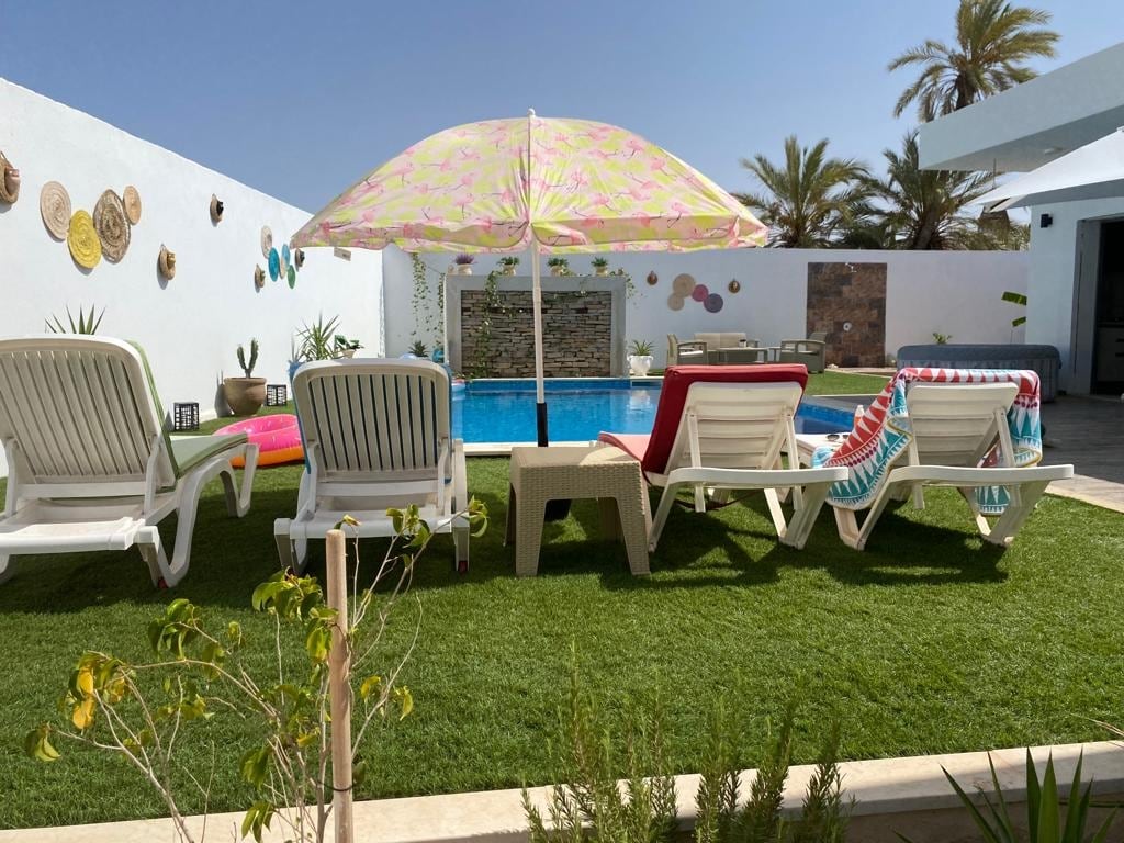 Visus jums reikalingus patogumus rasite mūsų didelėje viloje su 10/4 baseinu, atsipalaidavimu ir poilsiu garantuotu! Idealiai tinka švyturio kelyje tarp Sidi Yati paplūdimio ir Midoun, netoli visų patogumų, miesto centro ir paplūdimio. Netoli vilos už 300 m rasite visą reikiamą būtiniausių prekių parduotuvę , mėsinę, kepyklą, paštą, mečetę, restoraną, pvz., zammouri kepsnines.