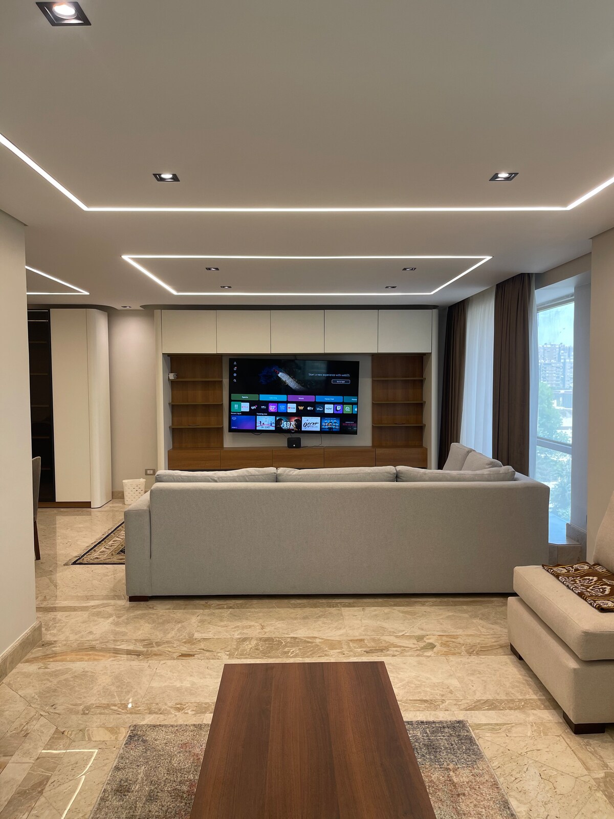 Sveiki atvykę į mūsų gražiai suprojektuotą 3 miegamųjų modernų butą pačioje Mohandessin širdyje, iš kurio atsiveria kvapą gniaužiantys vaizdai ir neprilygstama elegancija. Šiame nuostabiame bute, kuris puikiai tinka šeimoms, grupėms ar verslo keliautojams, jame yra elegantiškas, šiuolaikiškas interjeras, jaukūs miegamieji, prašmatni svetainė ir pilnai įrengta virtuvė. Įsikūrę puikioje vietoje, esate vos už kelių žingsnių nuo geriausių restoranų, kavinių ir parduotuvių. Patirkite tobulą stiliaus ir komforto derinį šiame išskirtiniame jaukiame poilsyje.