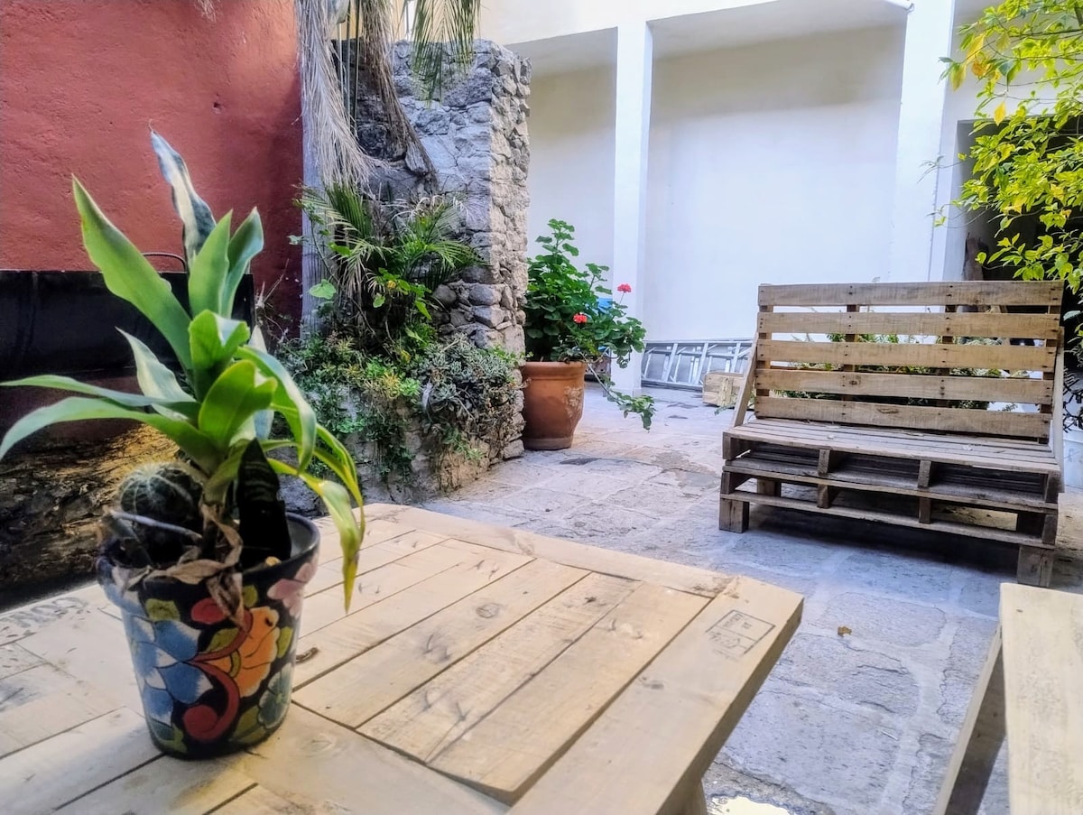 Atsižvelgiame į Airbnb rekomendacijas dėl jūsų saugumo ir dezinfekuojame visas erdves. Erdvi 90 kv. m loftas, su savo jaukiu stiliumi, svetaine, valgomuoju, virtuve, karališko dydžio lova, įsikūręs pirmame pastato aukšte, su prieiga prie stogo terasos. 2 kvartalai nuo istorinio centro ir San Miguel de Allende parapijos ir pusė kvartalo nuo amatų turgaus, ramu jūsų poilsiui, įrengta viskuo, ko jums reikia. Visi čia laukiami ramios viešnagės.