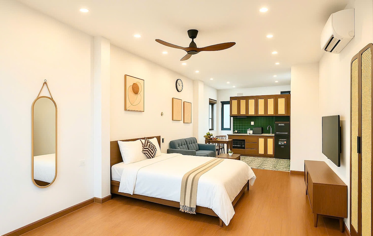 Hello! Your studio apartment is 38m2 high-class like a luxurious and charming 5-star hotel with a comfy bed, private bathroom, kitchenette and a balcony overlooking the West Lake. Especially, you have access to a high-class gym, swimming pool and sauna. Are you traveling, on business trip or simply looking for a private and romantic place? It is a great choice for you, Let’s come and experience! We’re excited to see you here! Best regards, Luxury Econest team