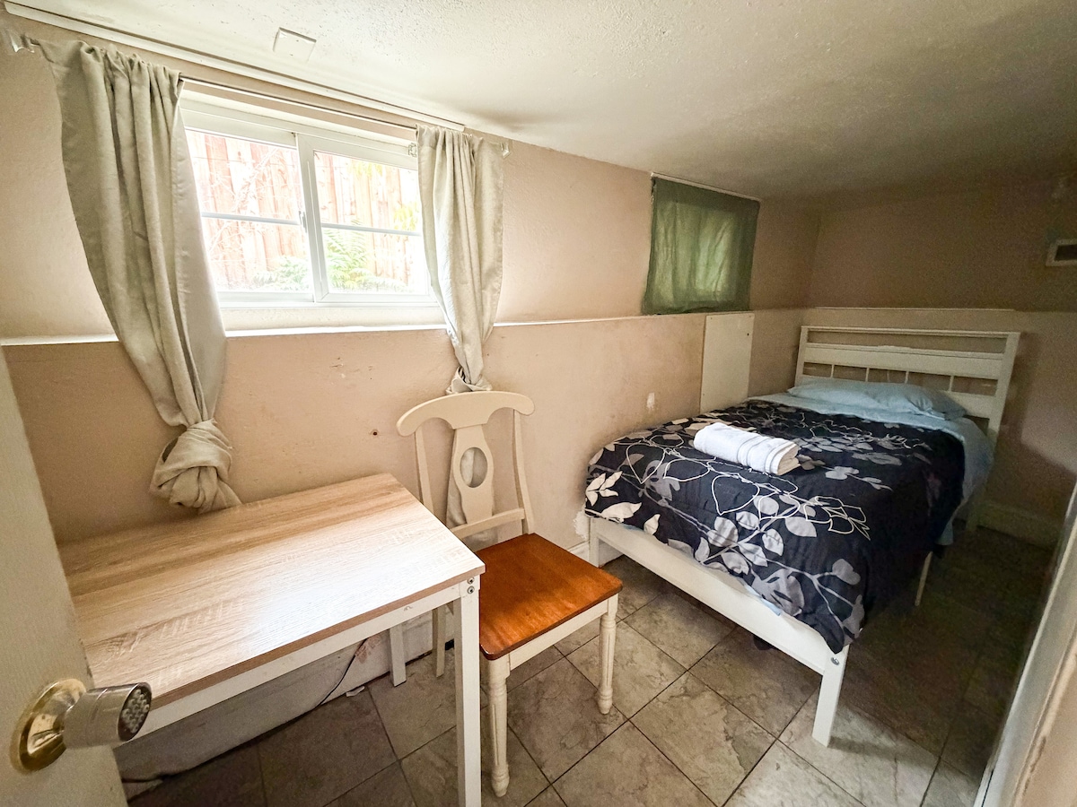 Tai 1 dvipusio namo vienetas (iš viso 2 vienetai, bendras kiemas, visi kambariai yra privatūs). Labai didelis butas su 900 kvadratinių pėdų plotu, kuriame yra 1 miegamasis, didelė svetainė, vonios kambarys, visa virtuvė ir skalbykla. Jame taip pat yra išskirtinis įėjimas, įvažiavimas į automobilių stovėjimo aikštelę ir terasa. Jis yra patogioje vietoje, netoli San Chosė ir Japantown centro. 2 min. pėsčiomis iki lengvojo geležinkelio stoties, puikiai tinka keliaujantiems ar verslo kelionėms. 2 dvigulės lovos, 1 miegamajame ir 1 svetainėje.