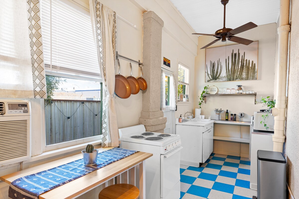 Grįžkite į Laukinių Vakarų erą su šia unikaliai išsaugota 1906 m. studija, esančia vos už kelių žingsnių nuo tramvajaus ir vos už pusės mylios nuo UofA ir Tuksono centro. Jauki svetainė/miegamasis ir vonios kambarys, siūlantis ramų prieglobstį tarp praeities žavesio. Atsipalaiduokite ant patogaus karališko dydžio čiužinio ir mėgaukitės moderniais patogumais, įskaitant didelės spartos belaidį internetą ir 50colių išmanųjį HDTV. Virtuvėlėje yra mikrobangų krosnelė, maža konvekcinė orkaitė (12colių picai), šaldytuvas ir Keurig.