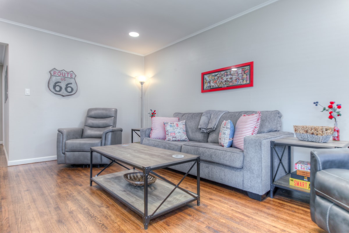 A 3-bedroom retro retreat in the heart of Broken Arrow's Rose District. We've filled this place with over $20,000 in vintage art, mid-century furnishings, and a dedicated arcade room with classic games—it's a vibe, not just a place to sleep. No checkout chores. We operate like a hotel—just enjoy your stay and leave when you're ready. Walk to Rose District shops, restaurants, and nightlife. Downtown Tulsa is 15 minutes away. Traveling with a group? Rent both sides of our duplex.