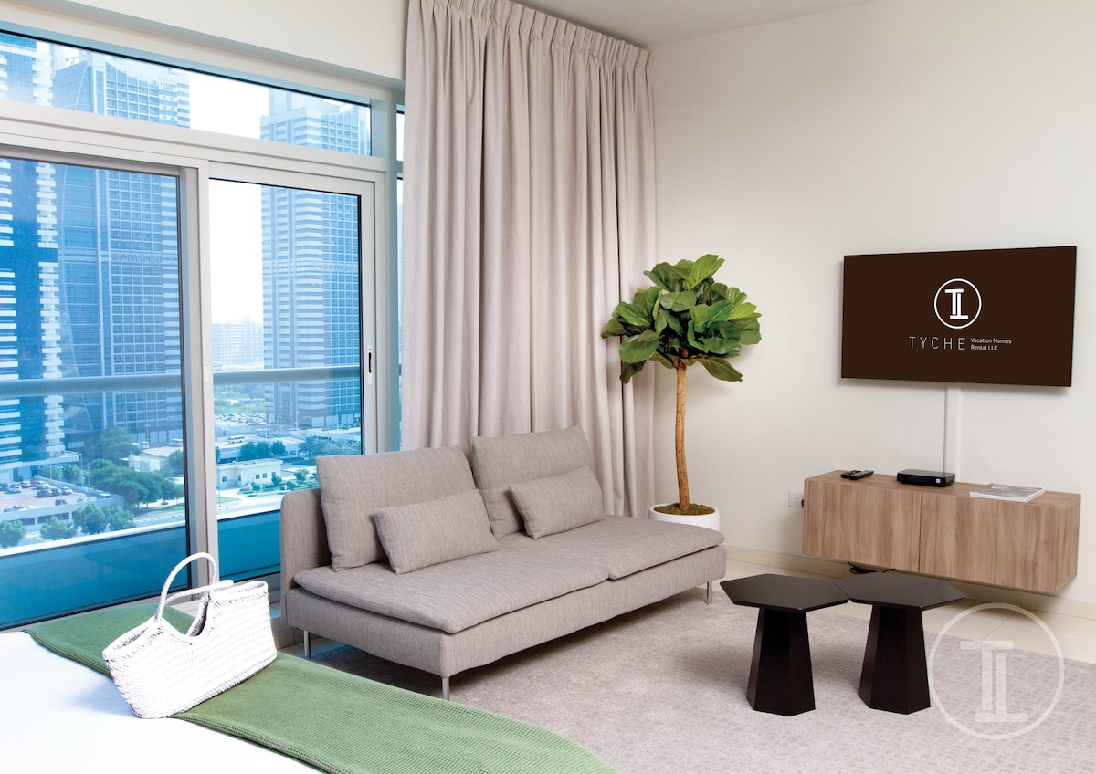 Galimos mėnesinės nuolaidos! Patobulinkite savo viešnagę šiuose nuostabiuose 1BR išmaniuosiuose namuose JBR, kur elegancija susitinka su naujovėmis. Šis butas su privačia pirtimi, kvapą gniaužiančiais prieplaukos vaizdais ir rafinuotu moderniu dizainu siūlo išskirtinę prabangą. Mėgaukitės sklandžiu gyvenimu su išmaniaisiais valdikliais, gražaus stiliaus interjeru ir aukščiausios klasės patogumais - vos už kelių žingsnių nuo energingo JBR paplūdimio, pasaulinio lygio vakarienės ir pramogų. Puikiai tinka nepamirštamai viešnagei!