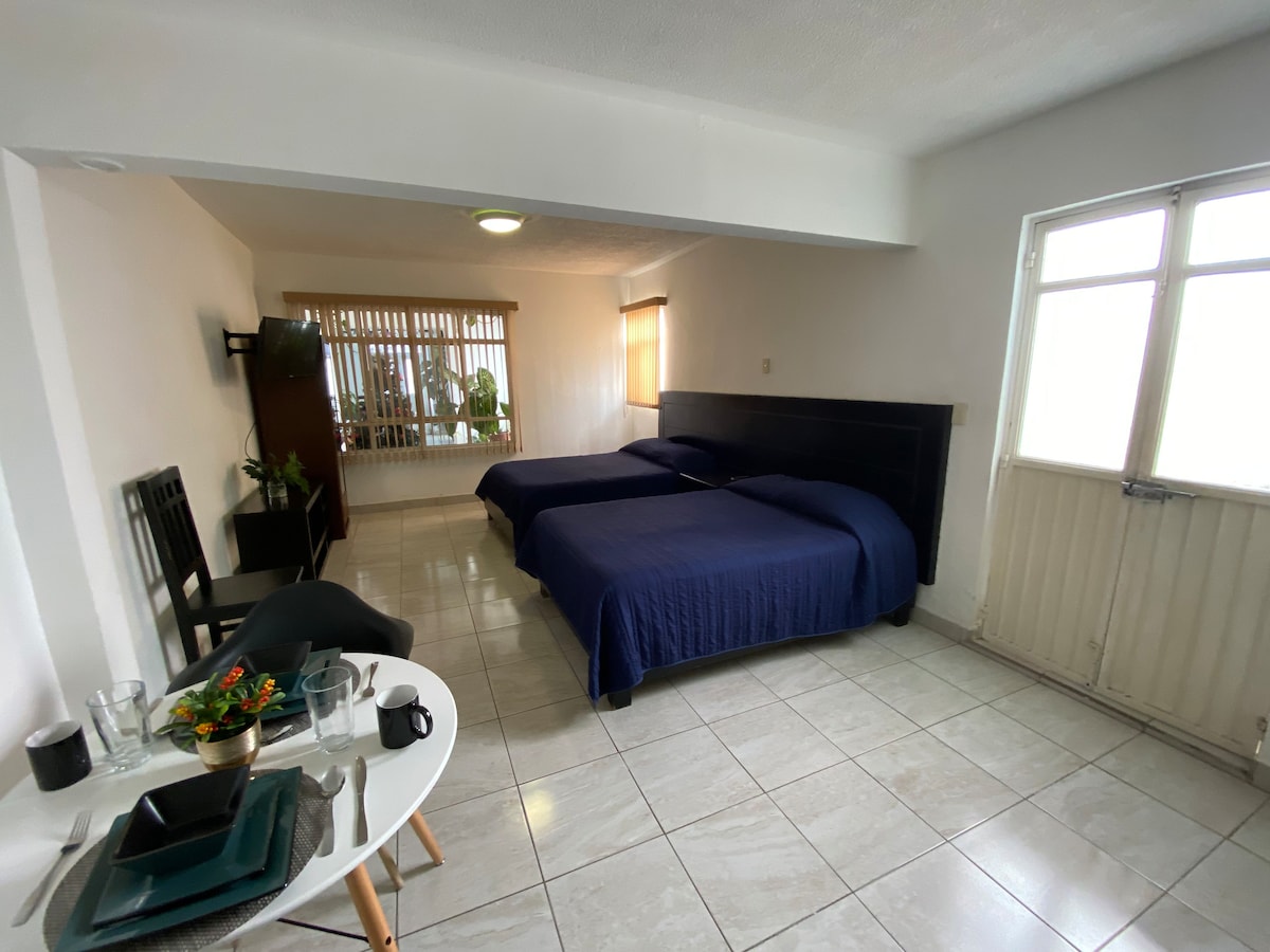Trečio aukšto butas, Uno Tres Įsikūręs už 10 min. kelio nuo Centro Histórico y Centros Comercialales. Svetainė Valgomasis Virtuvė su kepsnine (virykle), šaldytuvu, mikrobangų krosnele, kavos aparatu. Kiemas su skalbiniais Dvi dvigulės lovos Vonios kambarys su tualetu Privati automobilių stovėjimo aikštelė vienam automobiliui Įrengtas oro kondicionierius ir internetas Autonominis atvykimas Susitikimo zona su išankstiniu leidimu