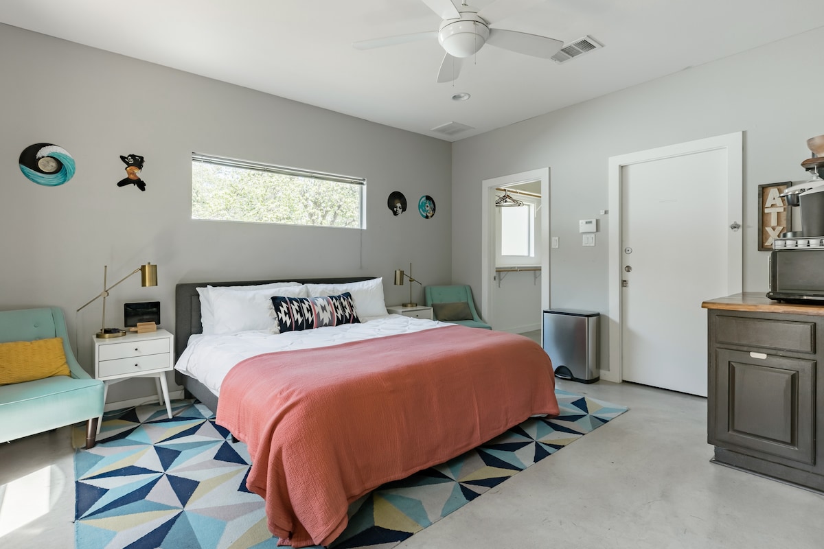 Pasinerkite į prabangą arba atsipalaiduokite, kad pamatytumėte unikalius Ostino žavesius iš patogaus, centre esančio starto aikštelės labiausiai pageidaujamame miesto rajone. Pasivaikščiokite, važiuokite dviračiu ar važiuokite dviračiu į visas Ostino lankytinas vietas iš šios naujai renovuotos erdvės, užtvindytos natūralios šviesos ir aukščiausios klasės patogumais, įskaitant Samsung išmanųjį televizorių, namų asistentą, Nest termostatą, ekranuotą verandą ir atminties putplasčio čiužinį - visa tai yra šalia gurkšnojančio upelio.