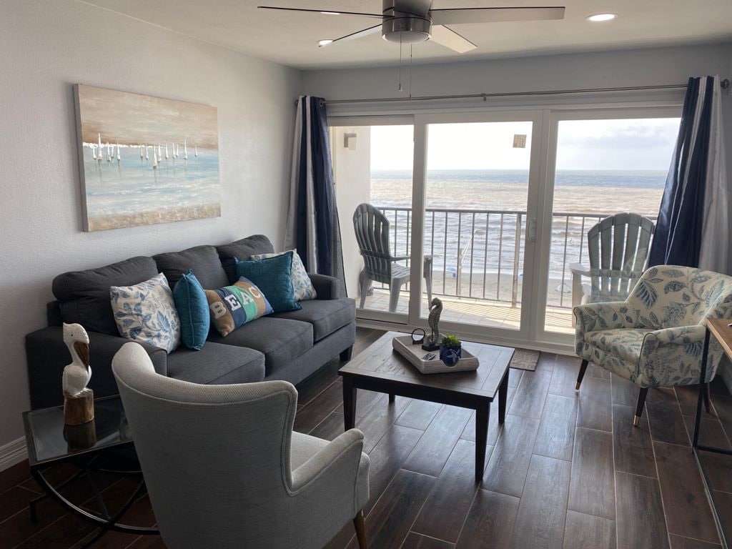 This newly renovated Beach front condo is the perfect place for your friends and family to stay in Galveston. The unobstructed view of the ocean from your private top floor balcony is breathtaking. The interior is modern, spacious and full of natural light. Intentional design, new renovations and simple pops of color make this space calming, clean and inviting. You cannot beat this location in regards to proximity of attractions and just a walk across the street to the beach!