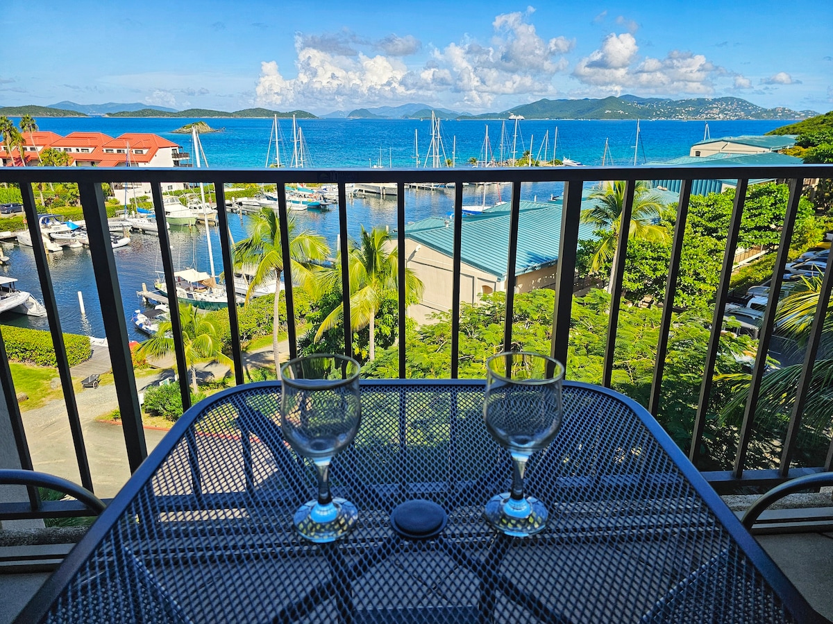 Įsikūręs Sapphire Beach Resort! Geriausi vaizdai į vandenyną ir prieplauką! Šiame gražiai dekoruotame ir pilnai įrengtame kondominiume gali miegoti iki 4 žmonių. Mėgaukitės nuostabiais prieplaukos ir Šv. Jono vaizdais iš privataus balkono. Kondominiume yra lauko kepsninė, pilnas kabelinės televizijos paketas, AC, WIFI ir pliušinė karališka lova bei dvigulė sofa. Jei reikia papildomos erdvės draugams ar šeimos nariams, turime kitą būstą Sapphire Beach Resort ir mielai apgyvendinsime jūsų grupę.