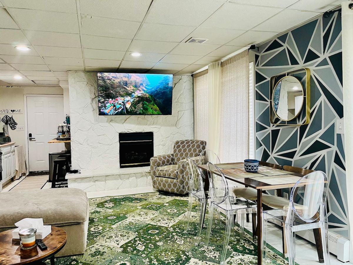 Tarp visų svečių atvyksta profesionali valymo įmonė. Nuosavybė yra vienintelis namas gatvėje, esantis šalia kelių akrų miškingos parko žemės. Pajuskite gamtos/privatumo jausmą, panašų į buvimo Niujorko valstijoje, tačiau jo centre yra Nuskendusios pievos parkas, Šiaurės valstija, MELAS. Taip pat netoli maisto parduotuvių ir kitų būtiniausių dalykų. 400 MBPS interneto ryšys tiems, kuriems reikia patikimo interneto ryšio darbui! Svetainėje yra ištraukiama dvigulė sofa, jei reikia 3-ios lovos.
