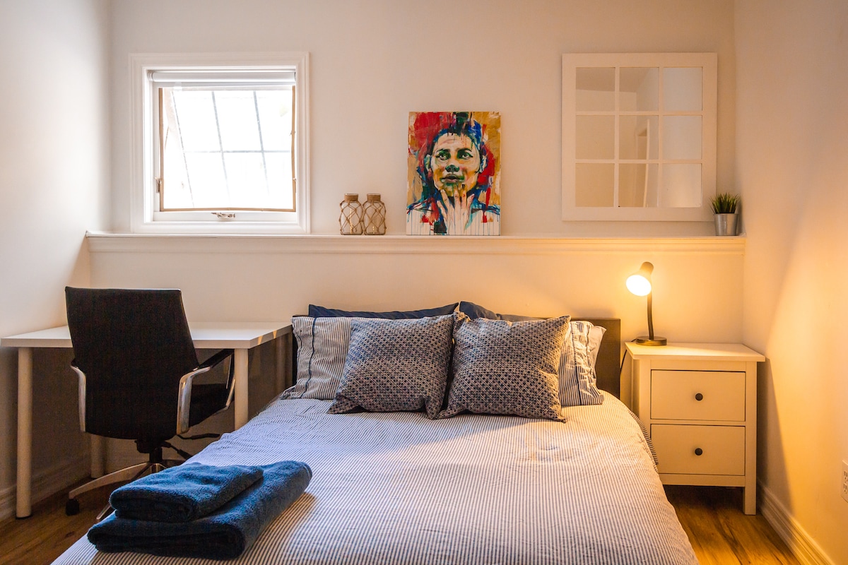 Šis stilingas kambarys puikiai tinka vienam ar dviem asmenims, lankantiems Torontą verslo ar pramogų tikslais. Šiame apartamente NĖRA automobilių stovėjimo aikštelės. Kad ir kas būtumėte, įvertinsite Marijos oazę, nes tai yra erdvus ir stilingas kambarys, atitinkantis visus jūsų poreikius. Turėsite atskirą įėjimą, privačią vonią ir mėgausitės privačia terasa, iš kurios atsiveria vaizdas į mūsų galinį kiemą. Atkreipkite dėmesį, kad likusioje namų dalyje, išskyrus mūsų kiemą, nėra bendrų erdvių.