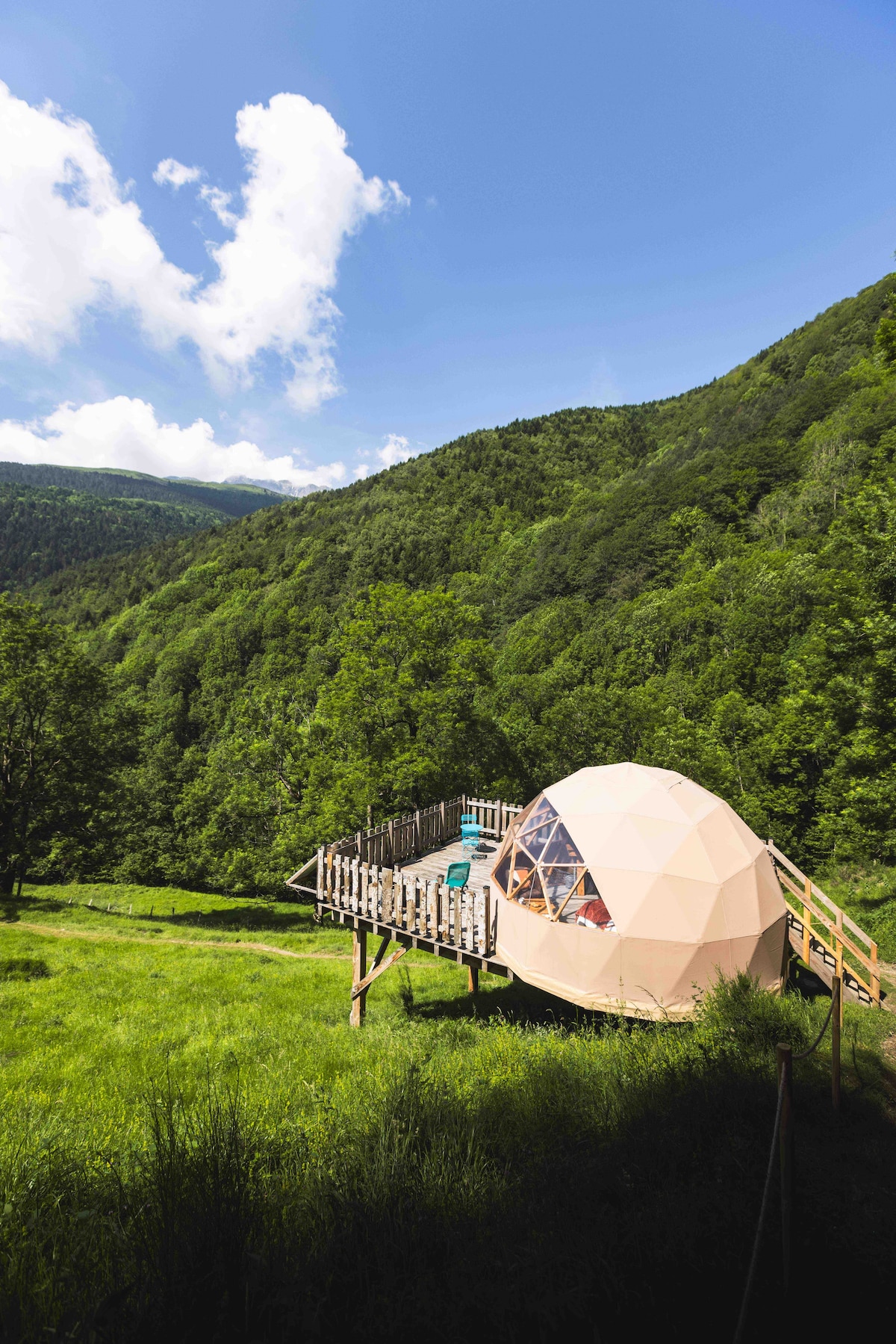 Jums ši unikali romantiška išvyka. Geodezinis kupolas yra „Camping D'Arrouach“ pėsčiųjų rajone, iš kurio atsiveria nuostabūs vaizdai į kalnus. Jūsų neįprastai viešnagei siūlome viešbučio paslaugas: pusryčiai patiekiami kupole, lova gaminama atvykus, vonios patalynė. 28 m2 erdvėje yra miegamasis su dvigule lova ir vonios kambarys su salos vonia atsipalaiduoti.