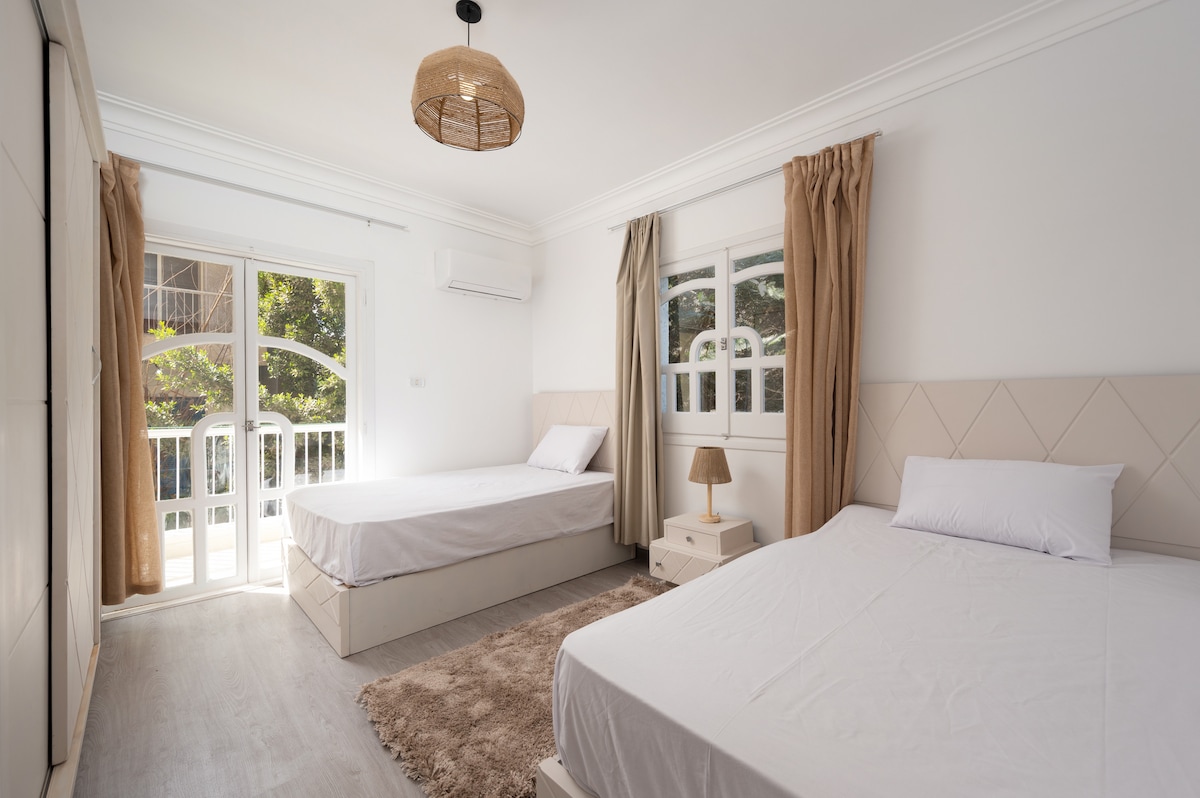 Welcome to this exceptional flat, ideal for four travellers seeking elegance and comfort! The natural light and generous space offer a soothing setting, ideal for a getaway in Maadi. Located in the heart of the city, this flat allows you to easily discover the treasures of Maadi while enjoying a luxurious and comfortable space. Think of checking out my profile, for more apartments in the same building! Book now for an unforgettable experience ✨