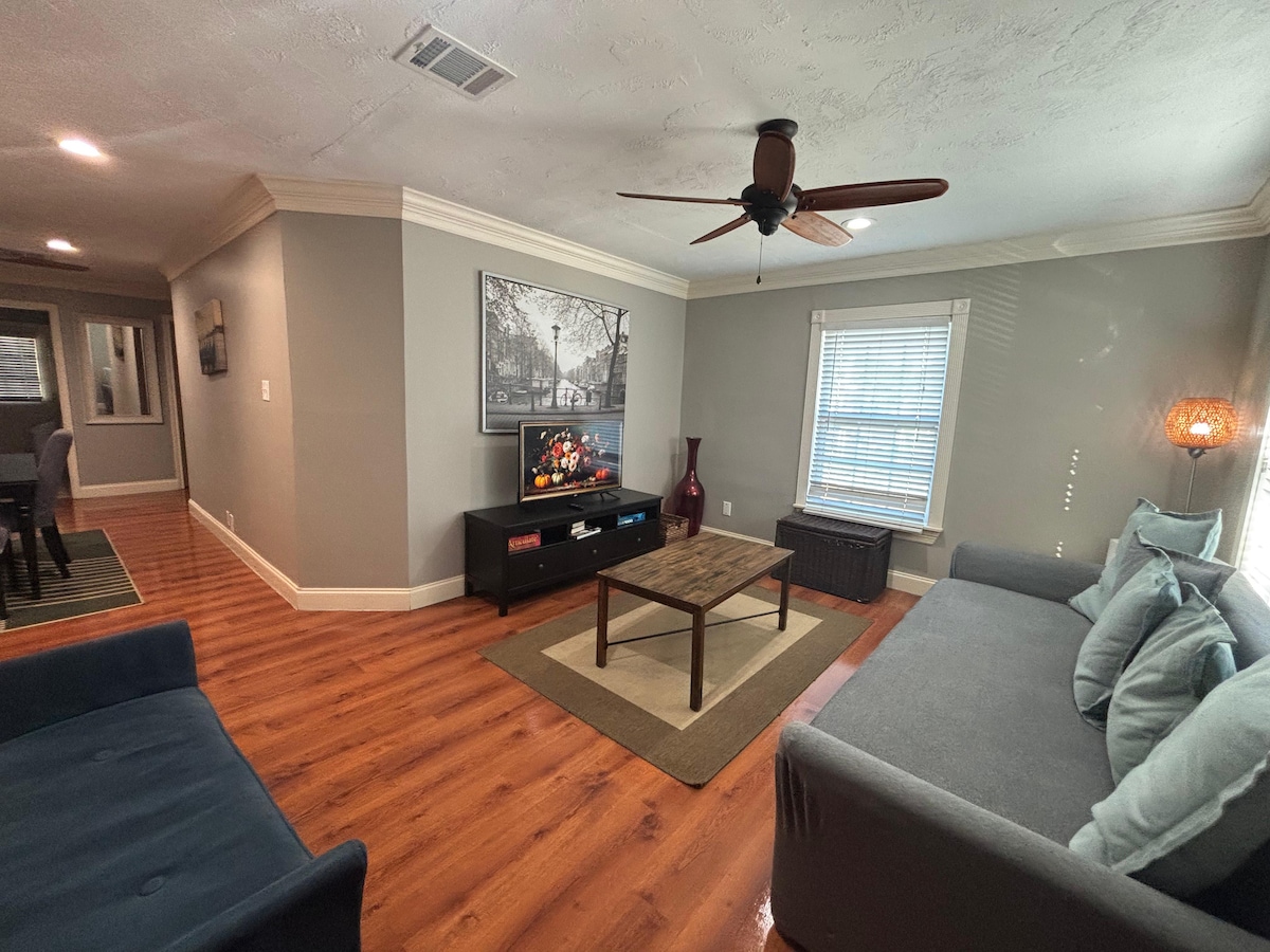 Atsipalaiduokite, padėkite ir mėgaukitės viešnage! Ši graži erdvė pirmame aukšte suteiks jums ramybės jausmą. Yra karališka lova puikiam nakties poilsiui. Patogioje vietoje, netoli Hiustono lankytinų vietų ir ligoninių. Nemokamai: belaidis internetas, skalbyklė ir džiovyklė bute, vieši baseinai, viešas visą parą veikiantis kūno rengybos centras ir automobilių stovėjimo aikštelė. JOKIŲ AUGINTINIŲ, RŪKYMO AR VAKARĖLIŲ! **Prie priekinių durų yra apsaugos durų skambučio kamera, o terasoje - dvi, kurias suaktyvina judėjimas lauke.** Kad ir kur būtumėte puikūs!