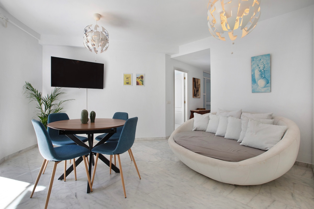 Studija centre. Šviesus Jame yra viskas, ko reikia gerai viešnagei SVETAINĖ: stalas, oro kondicionierius ir ventiliatorius, 43 colių išmanusis televizorius, Wi-Fi (greitas). Nemokamas „Netflix“ VIRTUVĖ: šaldytuvas, skalbimo mašina, mikrobangų krosnelė, skrudintuvas, virdulys, visa maisto gaminimo įranga VONIOS KAMBARYS: rankšluosčiai, gelis, šampūnas, plaukų džiovintuvas, lygintuvas 1 lova 1,50m 1 sofa-lova 80 cm 5 minučių pėsčiomis: traukinys, Nogalera 150 m stoties autobusai 11 minučių pėsčiomis: playa Baseinas iki rugsėjo 29 d.