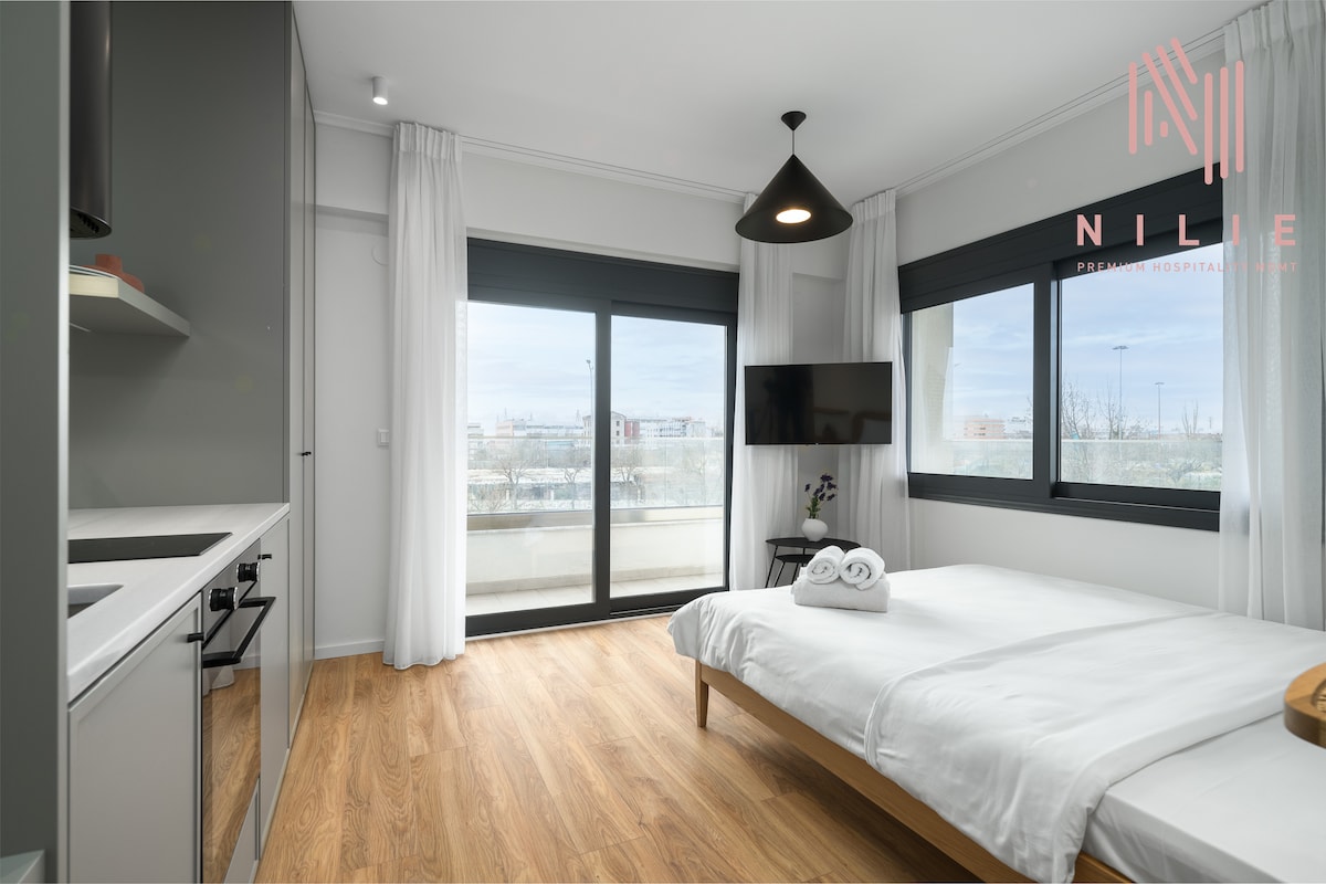 Visiškai nauja, prabangus, šviesus pirmame aukšte, studija 3 km nuo žiedinio kelio ir 10 km nuo miesto centro. Su anatominės kokybės čiužiniais ir pagalvėmis atpalaiduojančiai ir unikaliai patirčiai. Ramiame rajone ir 40 m autobusų stotelėje (32 A). 400 m atstumu yra Evosmos aikštė, kurioje yra daug restoranų ir kt., netoliese esantis Super turgus ir nemokama automobilių stovėjimo aikštelė. Jame yra virtuvė su visais reikmenimis ir išmaniuoju televizoriumi HDR 55colių su Netflix. Wi-Fi nemokamas 100 mps.
