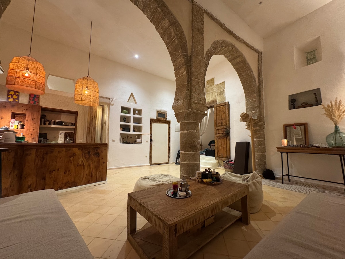 Ce logement unique, à l'entrée de la Médina, est un des plus beaux appartements-terrasse d'Essaouira ! Le dernier étage et le toit terrasse privatif sont situés au plus haut du quartier du Méchouar (maison bâtie en 1835) ! Ce "loft" de 140m² est aujourd'hui à la disposition des voyageurs privilégiés qui le réserveront. Terrasse aménagée & vue panoramique à 360° proche de tous les sites et commodités, ce qui facilite la planification de votre visite d'Essaouira.