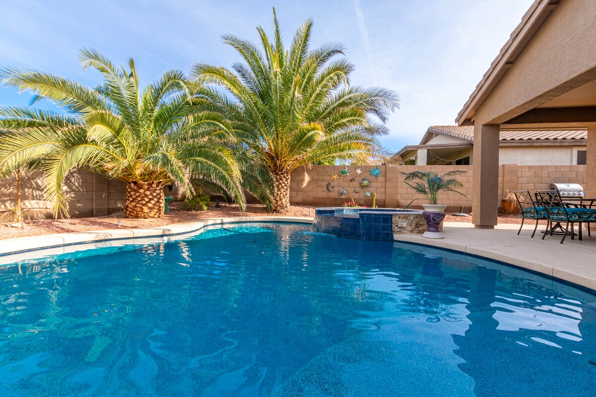 Sveiki atvykę į Coco Cabana! Atsipalaiduokite mūsų 3+ miegamųjų namuose, esančiuose ramioje gatvėje saulėtoje Estrella kalnų rančoje Goodyear, AZ! Už kiekvieno kampo yra linksma, laiminga atmosfera su Insta vertingomis freskomis ir retro Palm Springs dekoru. Užmeskite šiek tiek mėsos į kepsninę, bevies į rožinį aušintuvą, pasiimkite savo coozie, pirmyn! Plūduriuokite baseine, pažaiskite putą ir karnizą arba atsipalaiduokite sūkurinėje vonioje ir mieloje kabanoje! Kino kambarys su didžiule sofa-lova, valgomasis iki 10 žmonių! STR#STR0000344