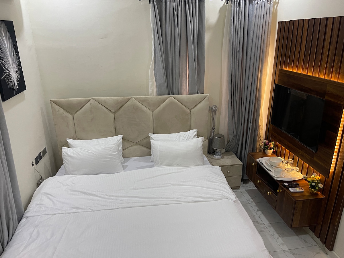You’ll love the stylish decor of this charming place to stay. It’s a one bedroom apartment with a shared sitting room, dinning, kitchen and a private toilet. Ac also available, microwave, running water, washing machine, and chilling fridge. Also Netflix, Dstv and YouTube on the go. Also there is a provision for meals on request ranging from stew, soup and others. Also light all through the night till dawn at least 10-15+ hours light daily.