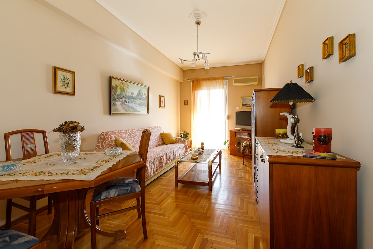 Prabangus butas su privačia automobilių stovėjimo aikštele (5 min. pėsčiomis) ir 3 minučių pėsčiomis iki Pasalimani! Yra 3 bdr ir 2 vonios kambariai, įskaitant privatų vonios kambarį viename iš kambarių. Kiekviename kambaryje yra išmanusis televizorius ir oro kondicionierius, kad jaustumėtės patogiai. Patirkite prabangą visose detalėse - nuo prašmatnių baldų iki elektrinio židinio. Jums patiks šio buto patogumas - šalia yra autobusų stotelė, o Atėnų tyrinėjimas yra labai lengvas! Nedvejodami susisiekite dėl kelionės iš oro uosto į savo butą!