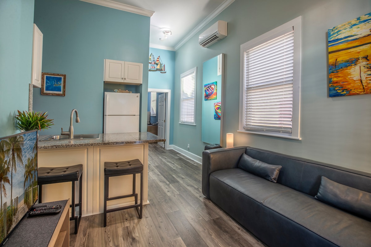 1B/1B condo located in Old Town less than 1/2 block from Duval St. & a couple blocks from the Southernmost Point, Hemingway House & many other Key West attractions. Bella Vita accommodates 2 adults only and features a large porch with chairs & table, living room with leather sofa, galley kitchen with bar seating, king-size bed with Tempurpedic mattress, desk area, bathroom with large walk-in shower, wi-fi, sound machine, 2 Smart TVs & DVD players.