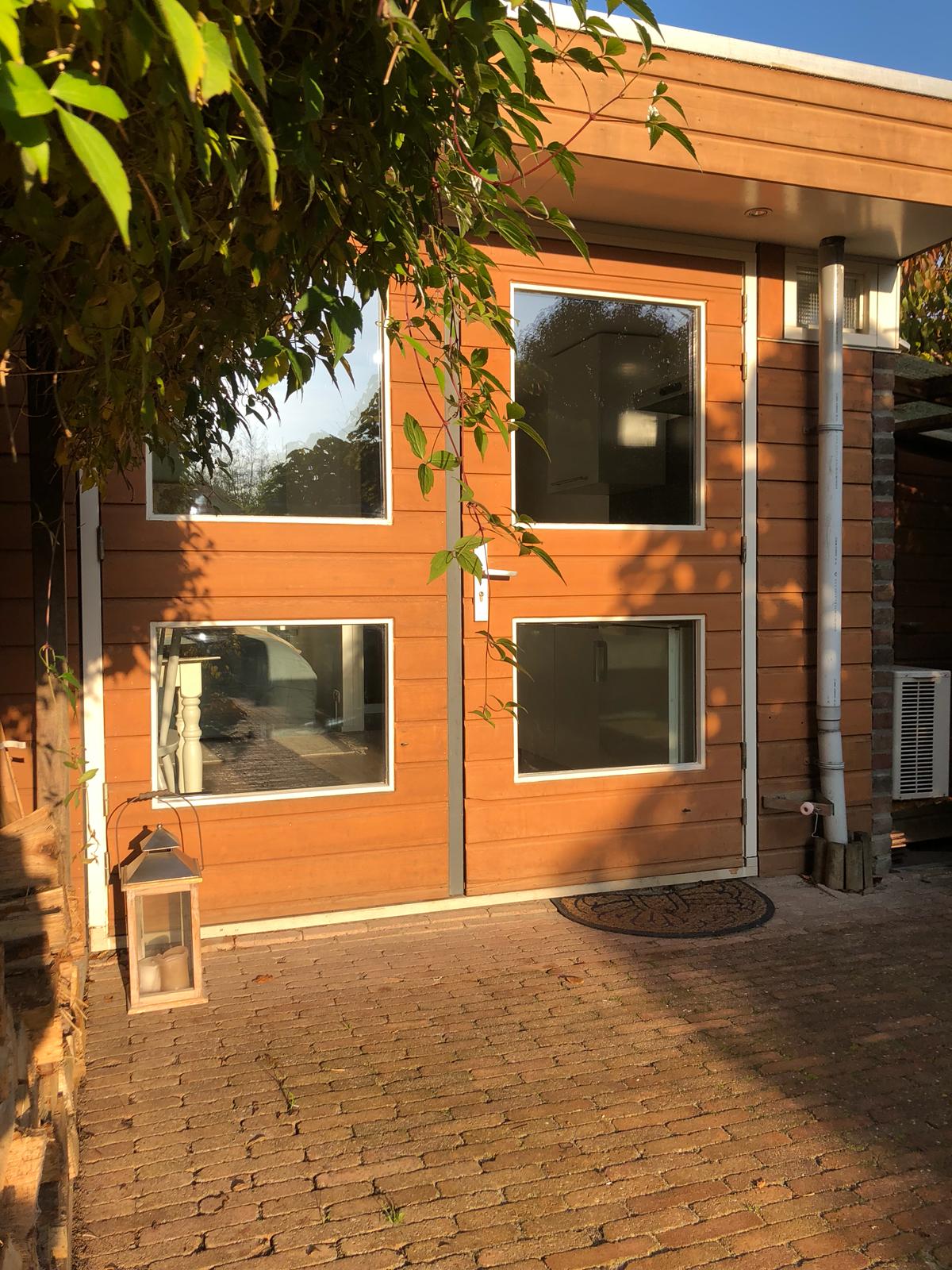 Graži maža studija, kurioje yra viskas, ko jums reikia.✨ Jis yra 10 m2 ploto, o lova pakelta, todėl sukuriama protinga vieta lagaminams laikyti. Yra sulankstomas stalas, kėdės, lentyna su kava ir arbata bei kriauklė, atskiras drėgnas kambarys su tualetu ir dušu. Kotedžas suteikia jaukumo💕 ir privatumo jausmą atsipalaiduoti, o tai yra gera vieta tyrinėti Amsterdamą, Almere ir kitus miestus.
